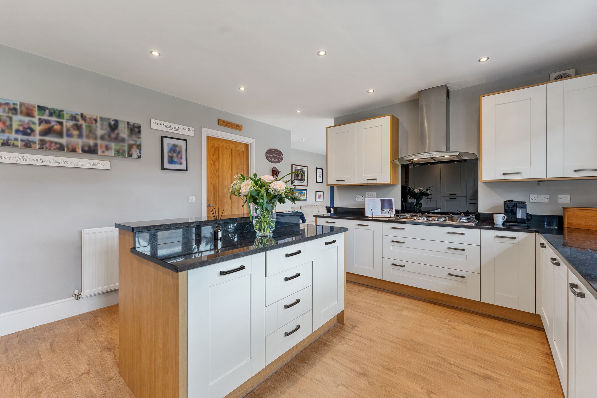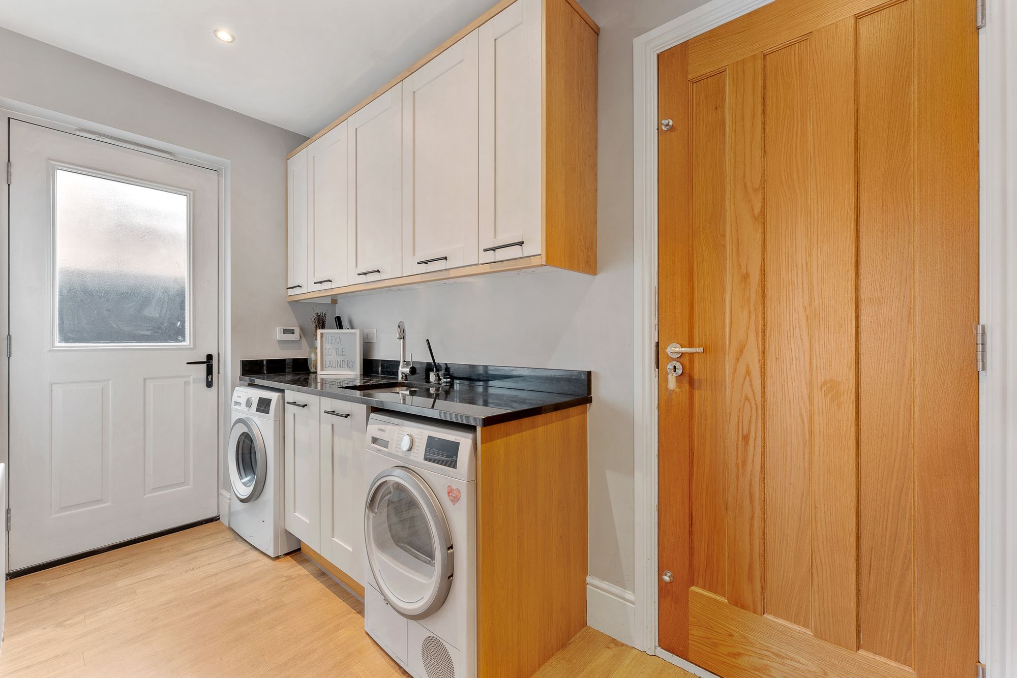 Make your way into the kitchen which seamlessly connects both main reception areas. Finished with granite worktops, AEG integrated appliances, and a five-ring gas hob, the kitchen has been designed for both practicality and style. There is ample storage in the shaker-style cabinetry, with a large window framing views out towards the garden. An adjoining utility room provides space for laundry and additional storage,and opens directly to the garden – ideal for muddy shoes and pets.