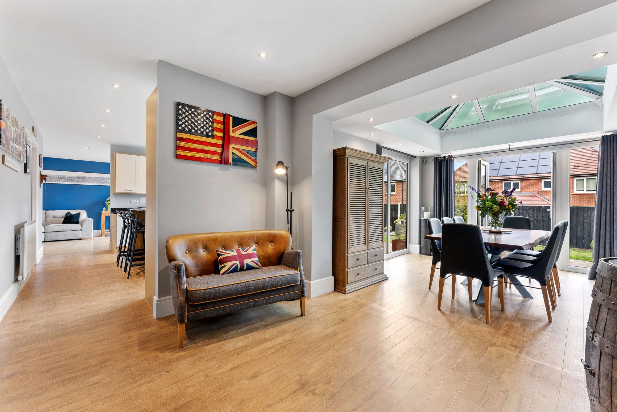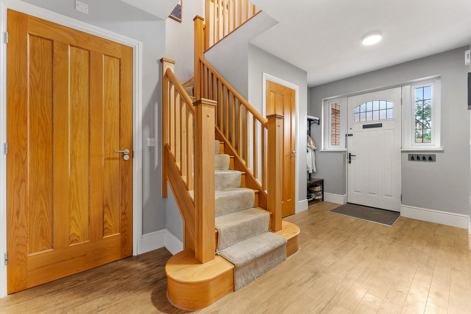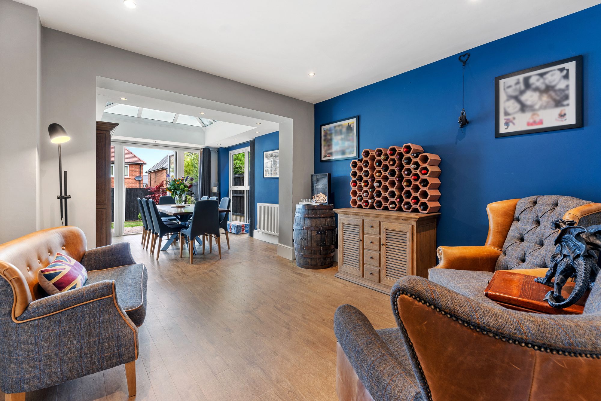 Pull onto the wide, double-width driveway, where there is space for multiple vehicles, and step beneath the gabled porch and into a bright and spacious hallway. Amtico oak-effect flooring flows throughout the ground floor, setting a warm and practical tone from the outset.