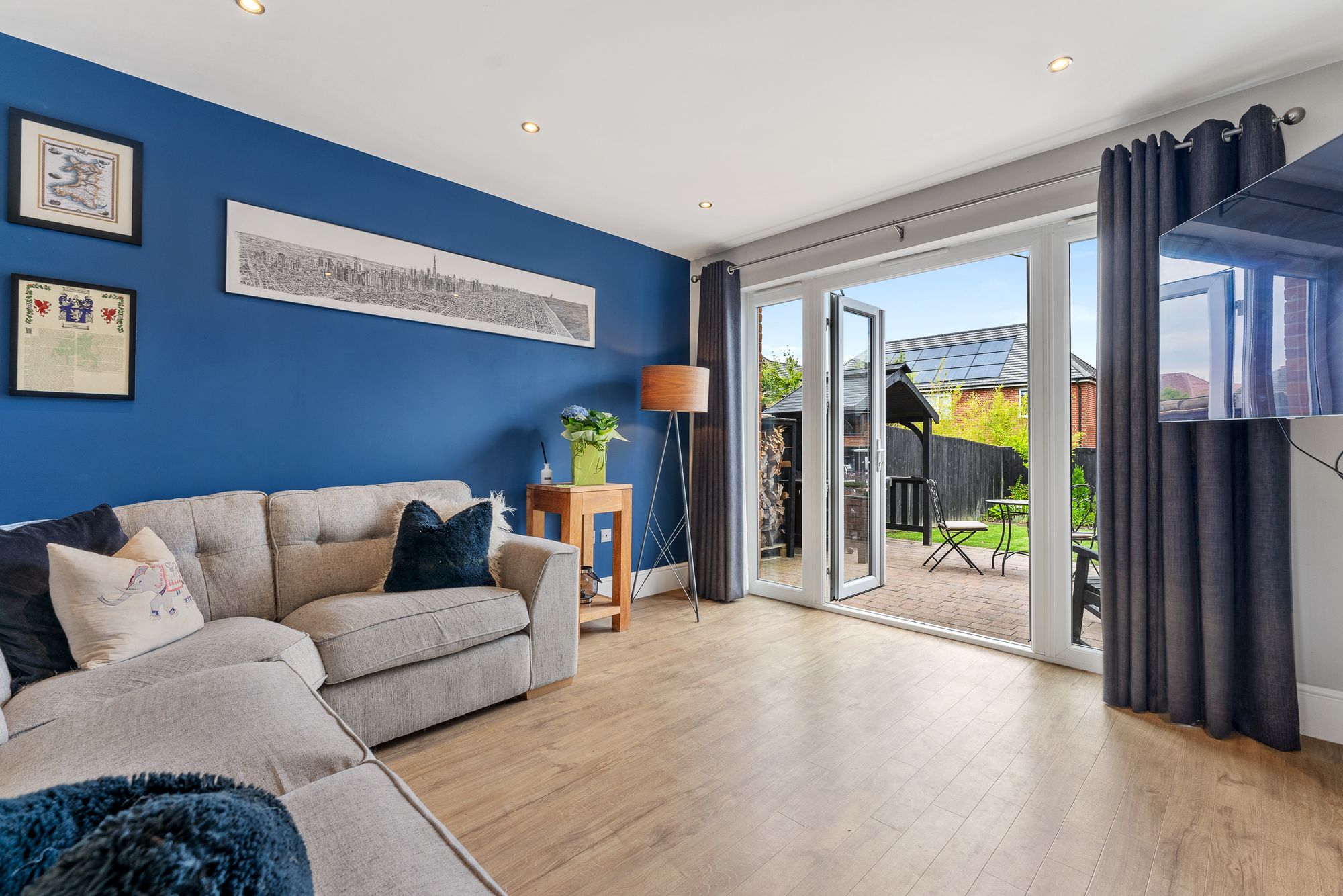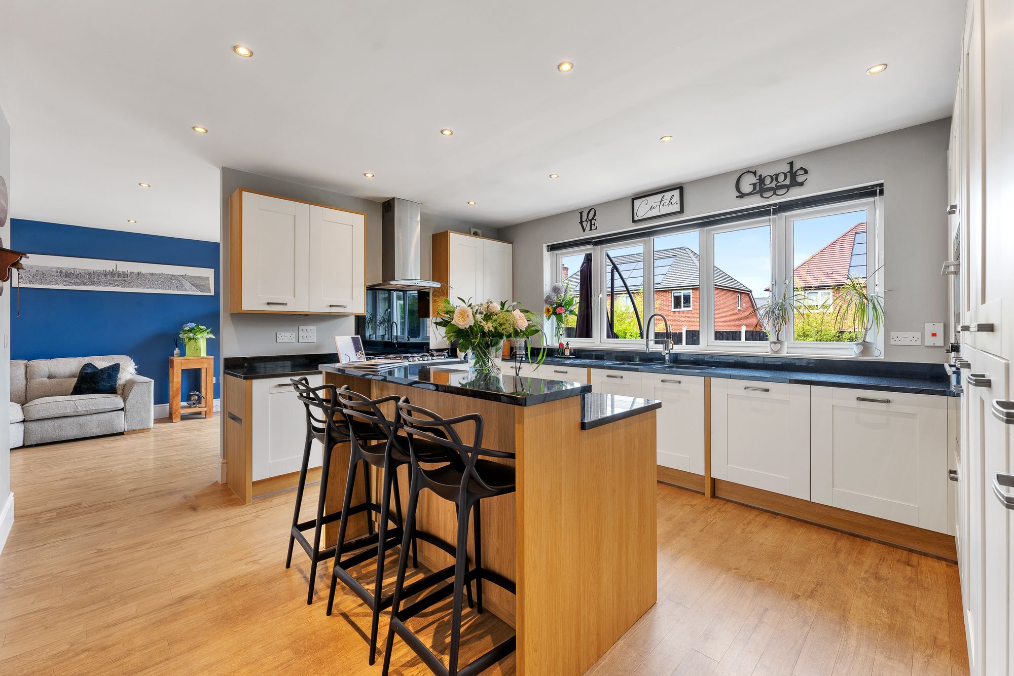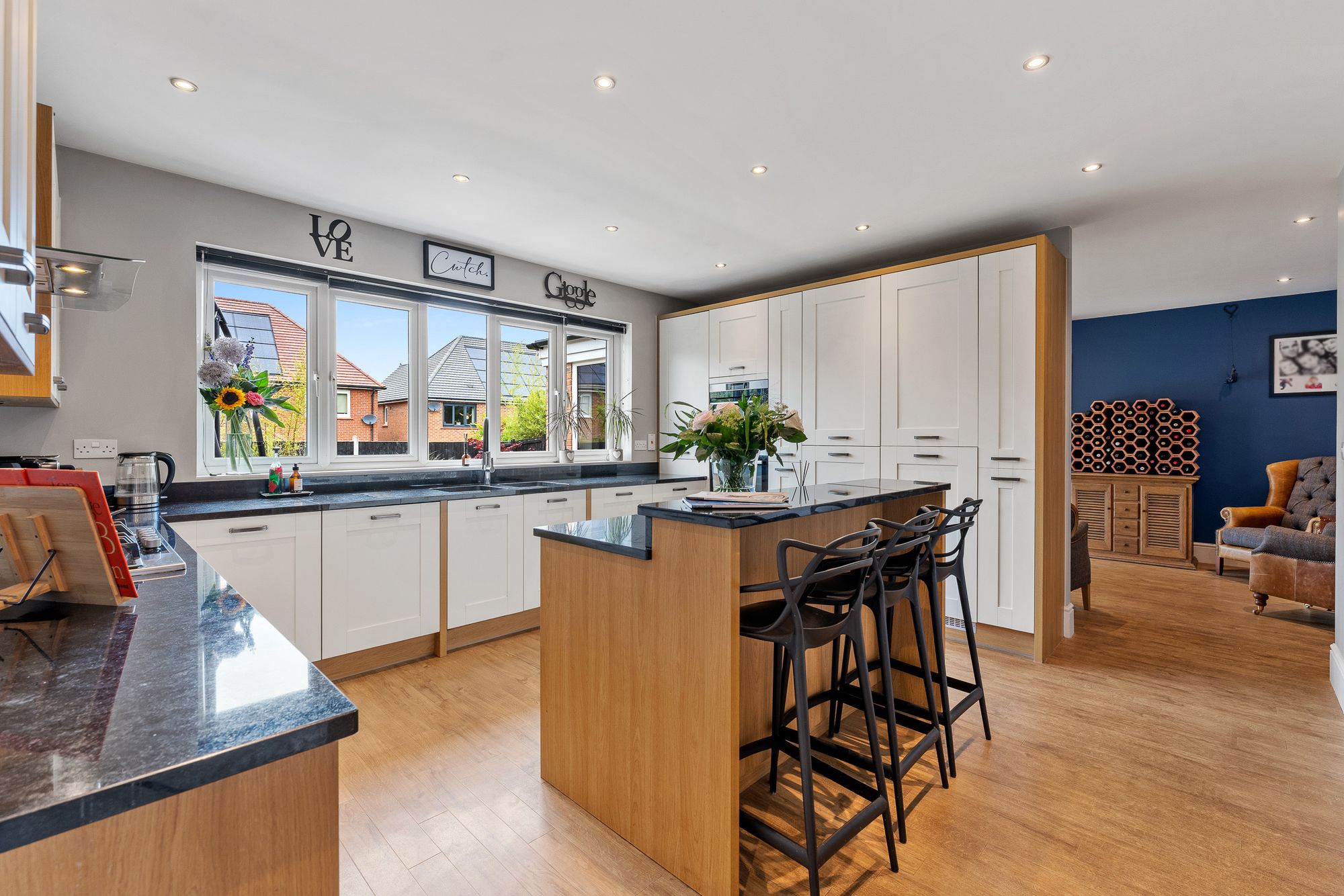 Pull onto the wide, double-width driveway, where there is space for multiple vehicles, and step beneath the gabled porch and into a bright and spacious hallway. Amtico oak-effect flooring flows throughout the ground floor, setting a warm and practical tone from the outset.