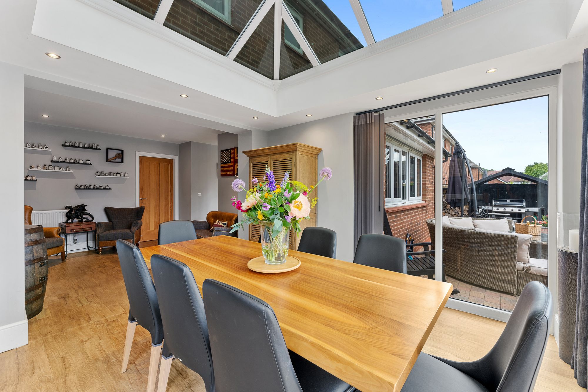 To the left, step into into the elegant lounge. A large bay window to the front allows light to pour in, creating a calm and inviting ambience. A second reception room to the rear – currently used as the dining room – has been thoughtfully opened up into an orangery-style space, now serving as a fantastic living and dining area. The vaulted ceiling, glazed roof, and French doors invite the light in and draw the eye out to the west-facing garden beyond.