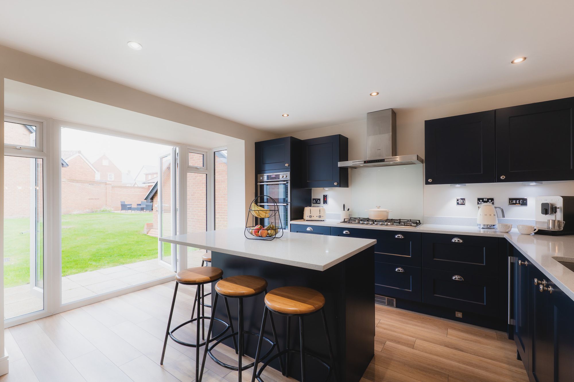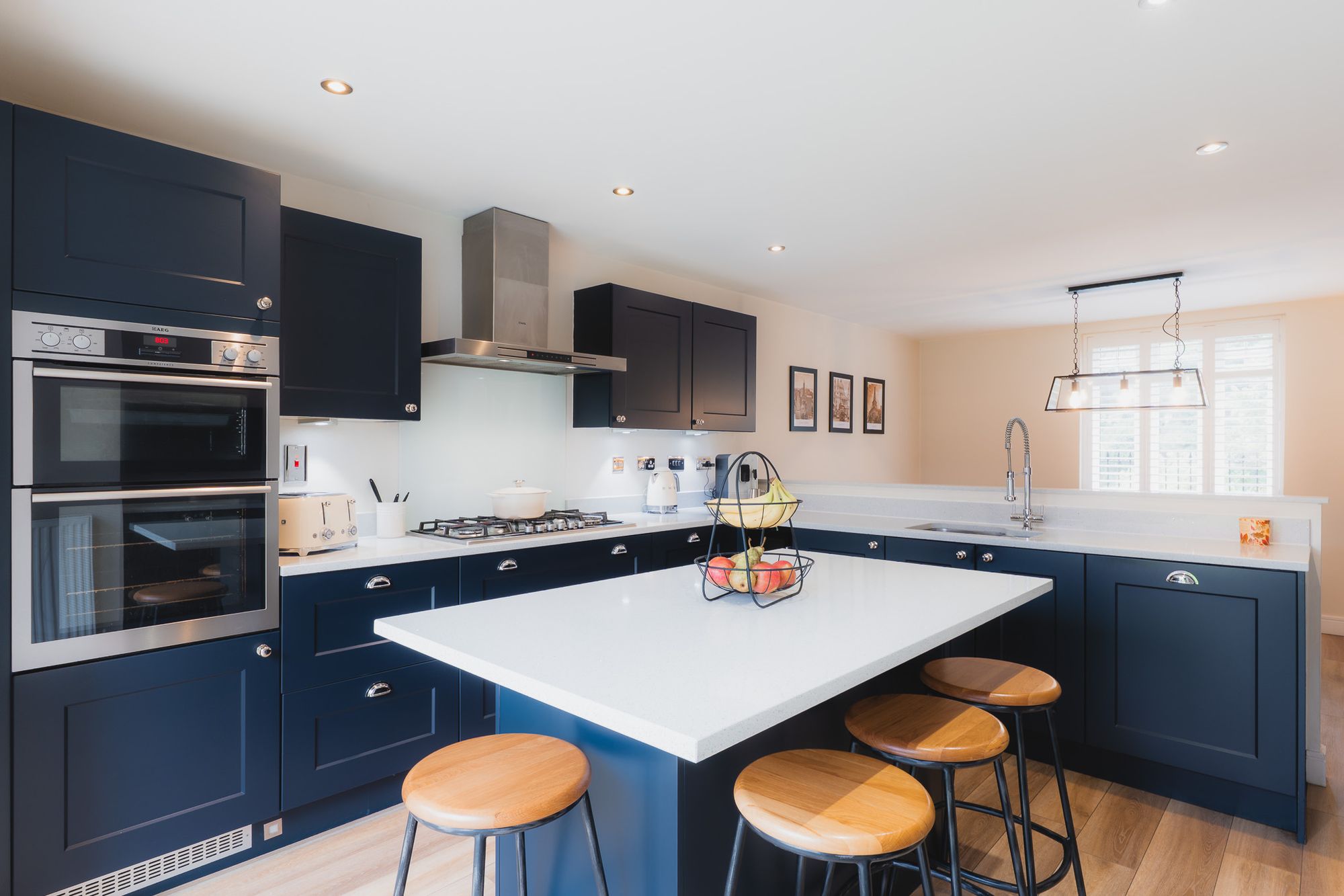With space for sociable dining at the central island-breakfast bar, beyond the kitchen horseshoe there is space for a large dining table, beneath a trio of industrial style pendant lights, overlooking the greenery to the front through a large plantation shuttered window.