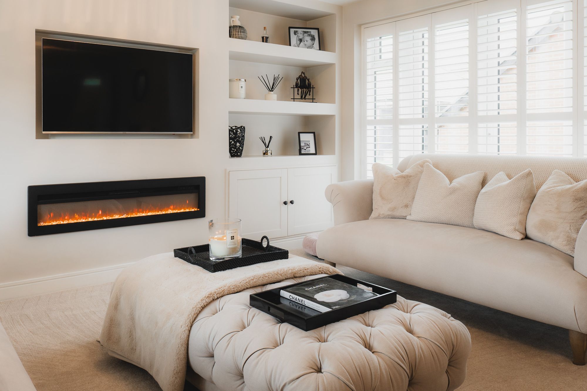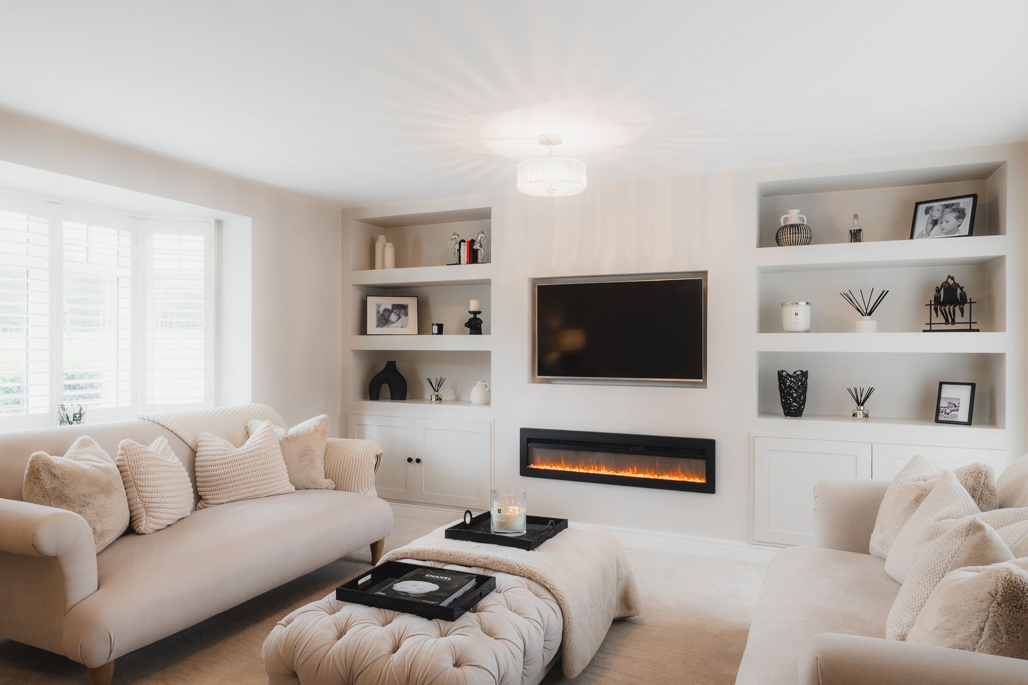 Cosy yet spaciously sublime, double doors also open to the carpeted lounge, where a built-in media wall features recessed shelving and fitted cabinetry to either side of the inset television and glass-fronted fire.