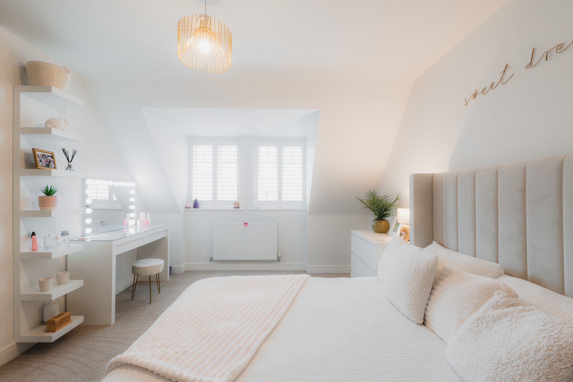 Next door, the current master suite is accessed via a walk-through wardrobe, brimming with fitted storage to either side. With storage tucked away from sight, the main bedroom is airy and light, with shuttered windows to two sides, and the privacy of an en suite bathroom with separate bath and shower.