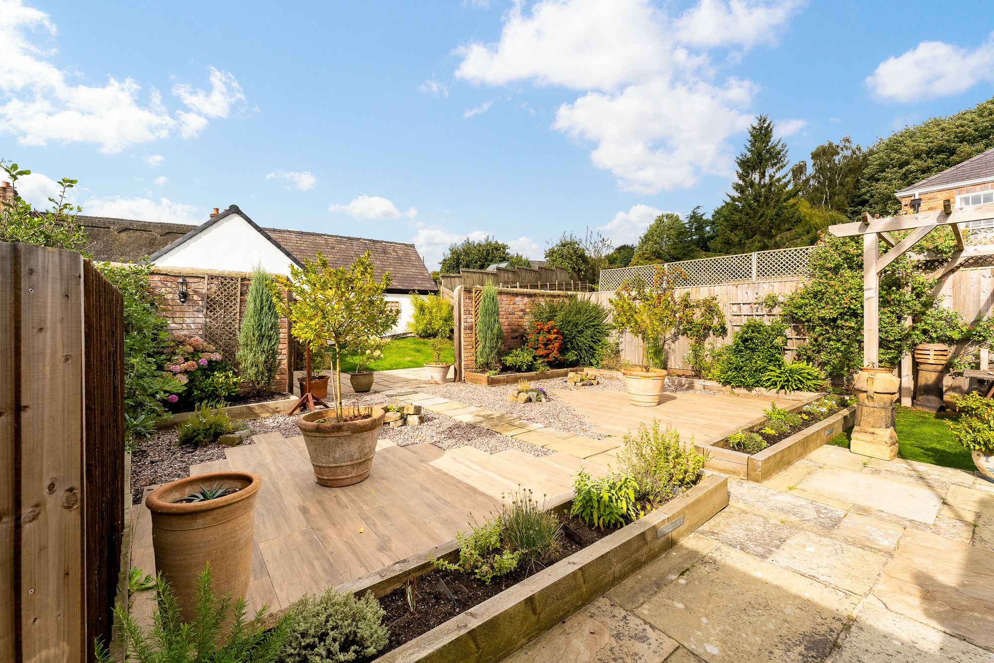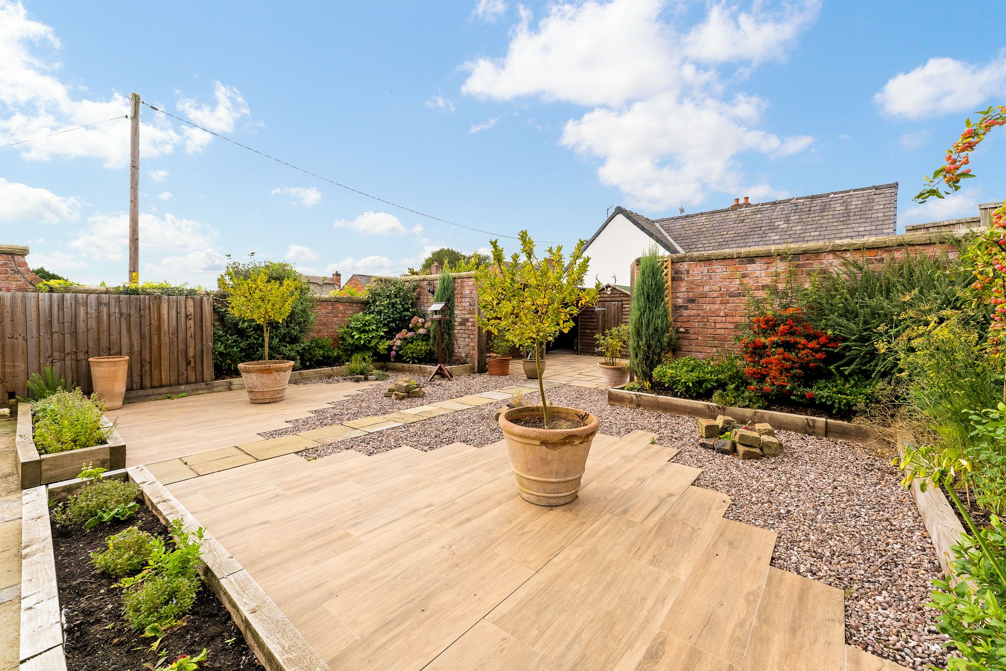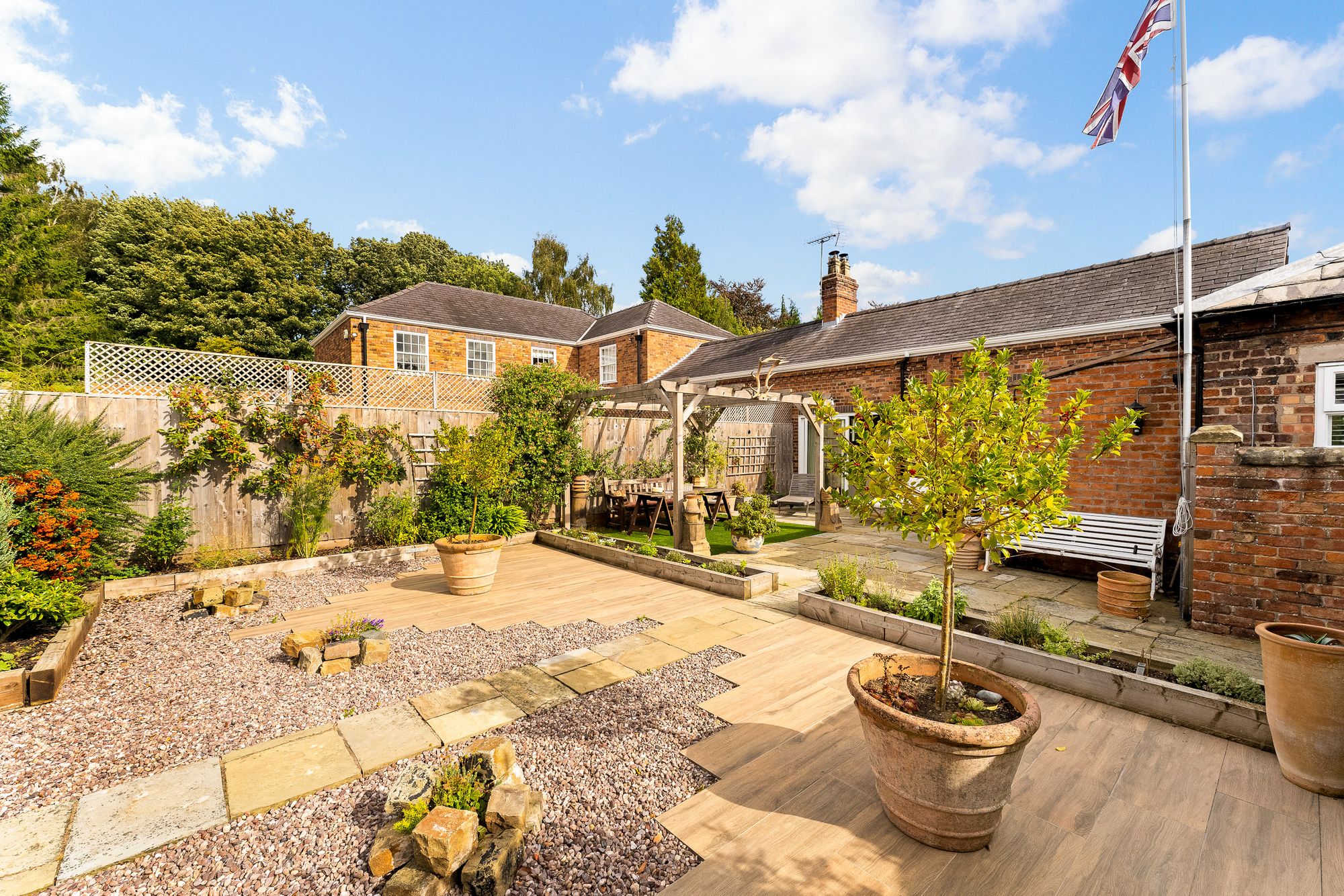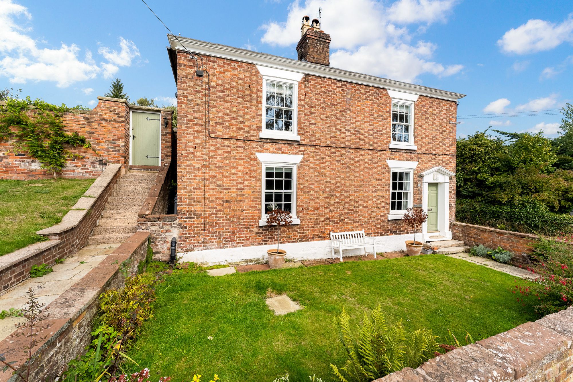 Steps rise from the front garden to a gate in the Cheshire brick wall, leading into the rear garden, once the site of a large outdoor swimming pool, now reimagined as a private flagged courtyard.