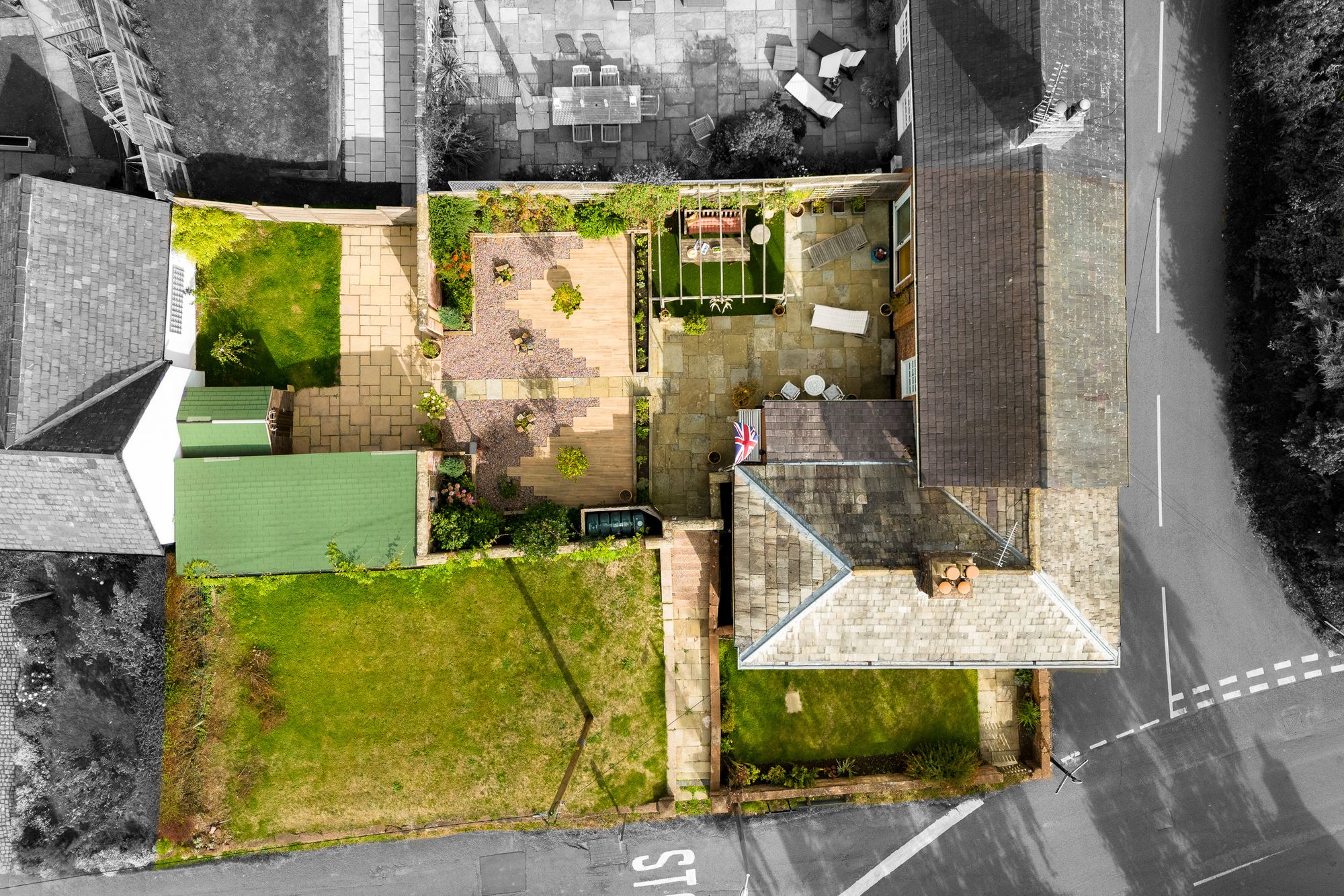 Filled with sun from late morning onwards, follow the rays around through the day, with a sheltered corner table perfect for evening drinks. Useful garden sheds, handy for tools and mowers, sit to the side, with parking available on Sapling Lane.