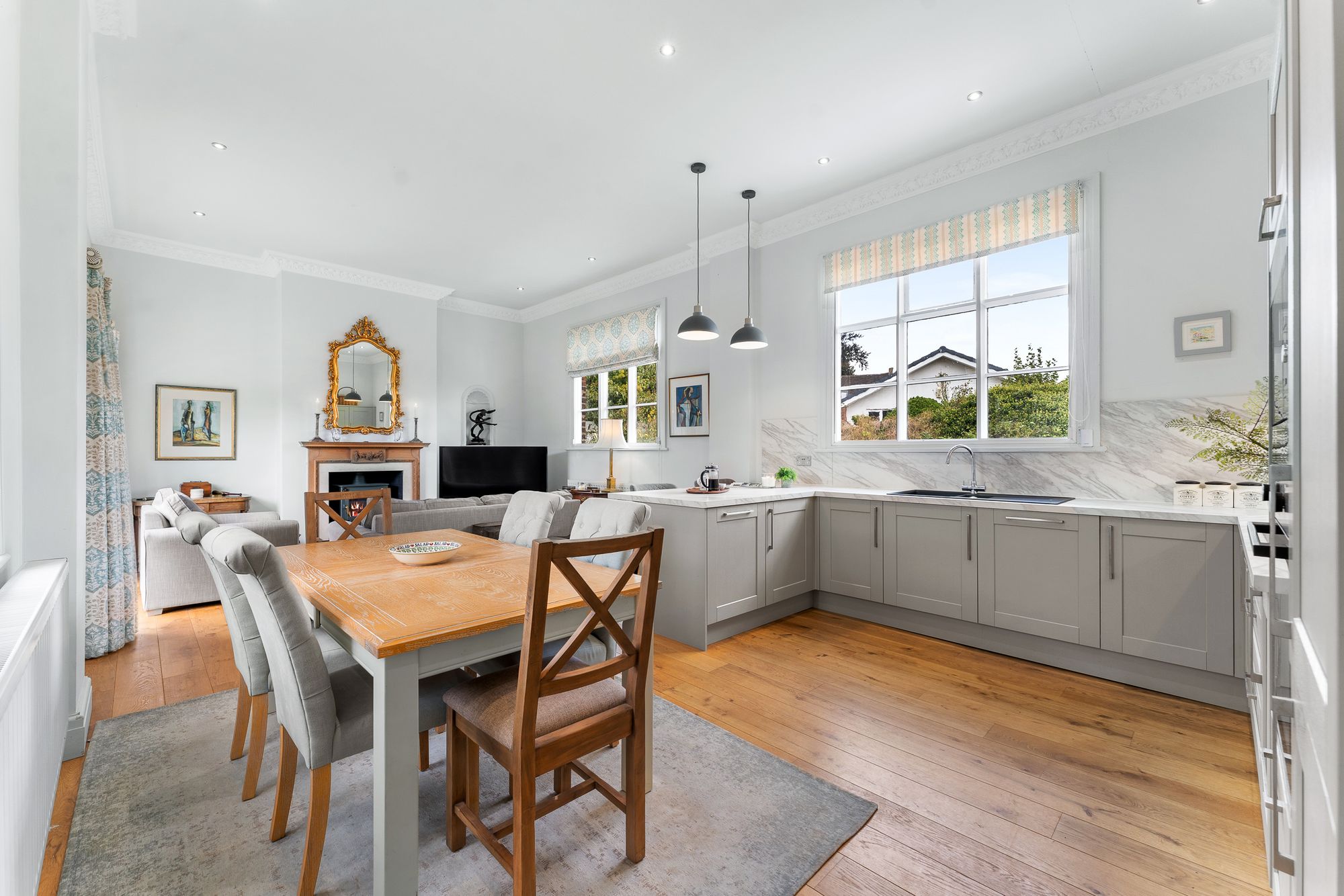 Awash with light, the heart of the home is undeniably the enormous open plan kitchen-dining-living room, where the soaring ceiling features modern spotlighting. Pendant lights hang down above the breakfast bar, where there is seating for two.