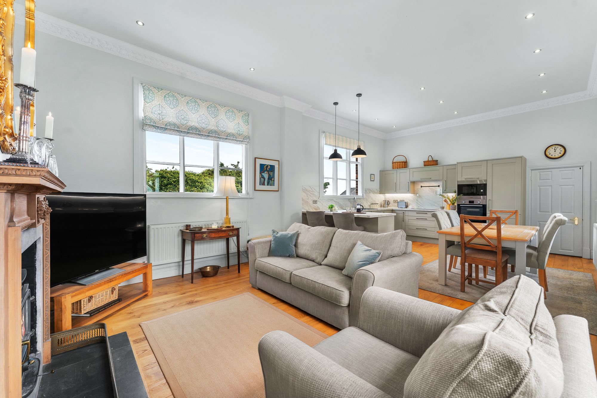Stairs lead up from the ground floor, where a door can be locked off to provide private living on the upper floor. Turning left, carpeted in grey and featuring an ornamental fireplace, the first-floor bedroom brims with light, with a large sash window looking out over the quiet comings and goings of village life below.