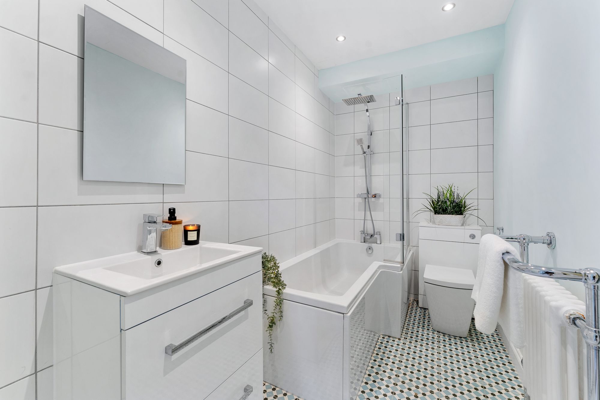 Serving both bedrooms is a shower room with modern rainfall walk-in shower, wash basin and WC.