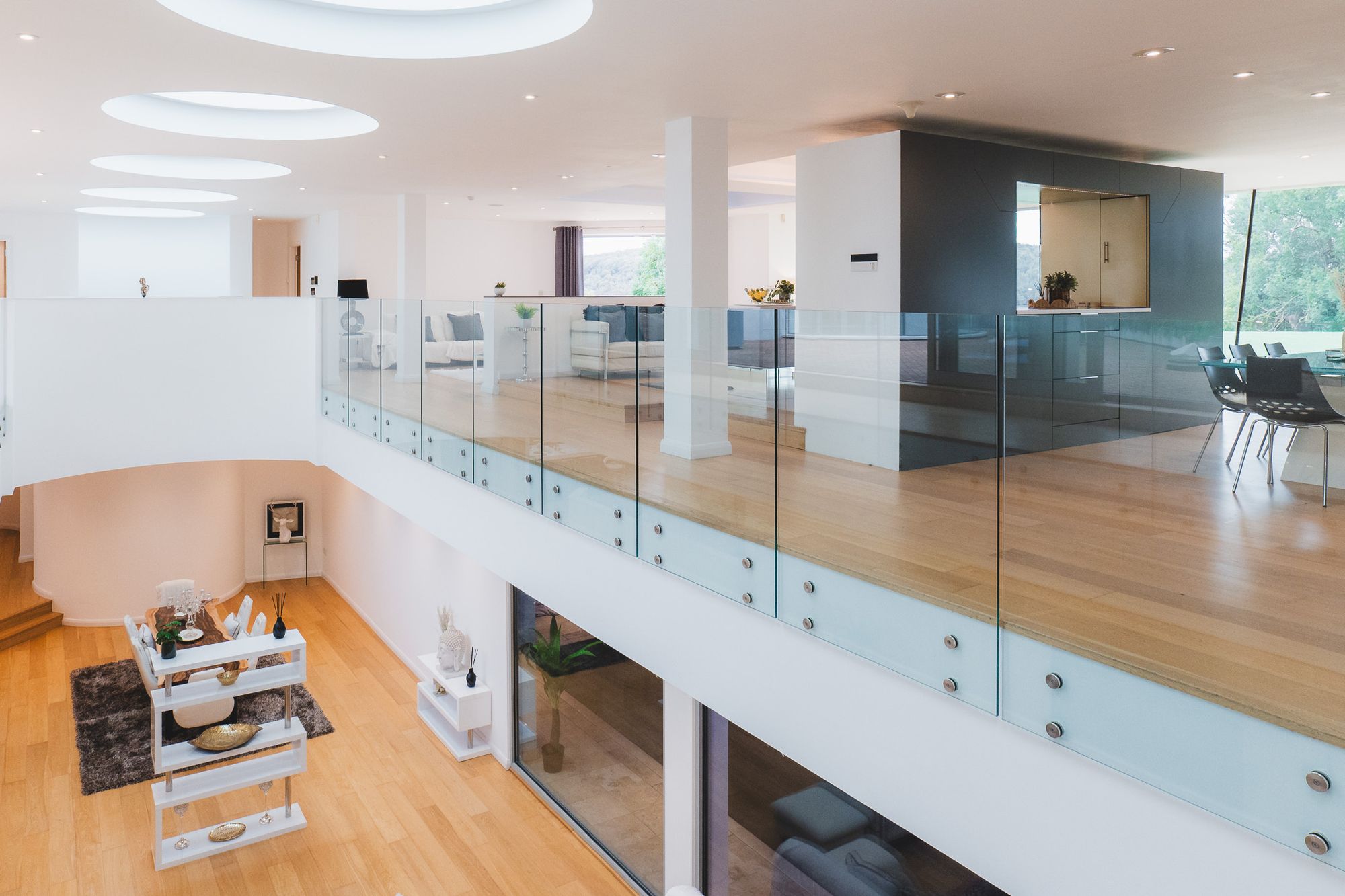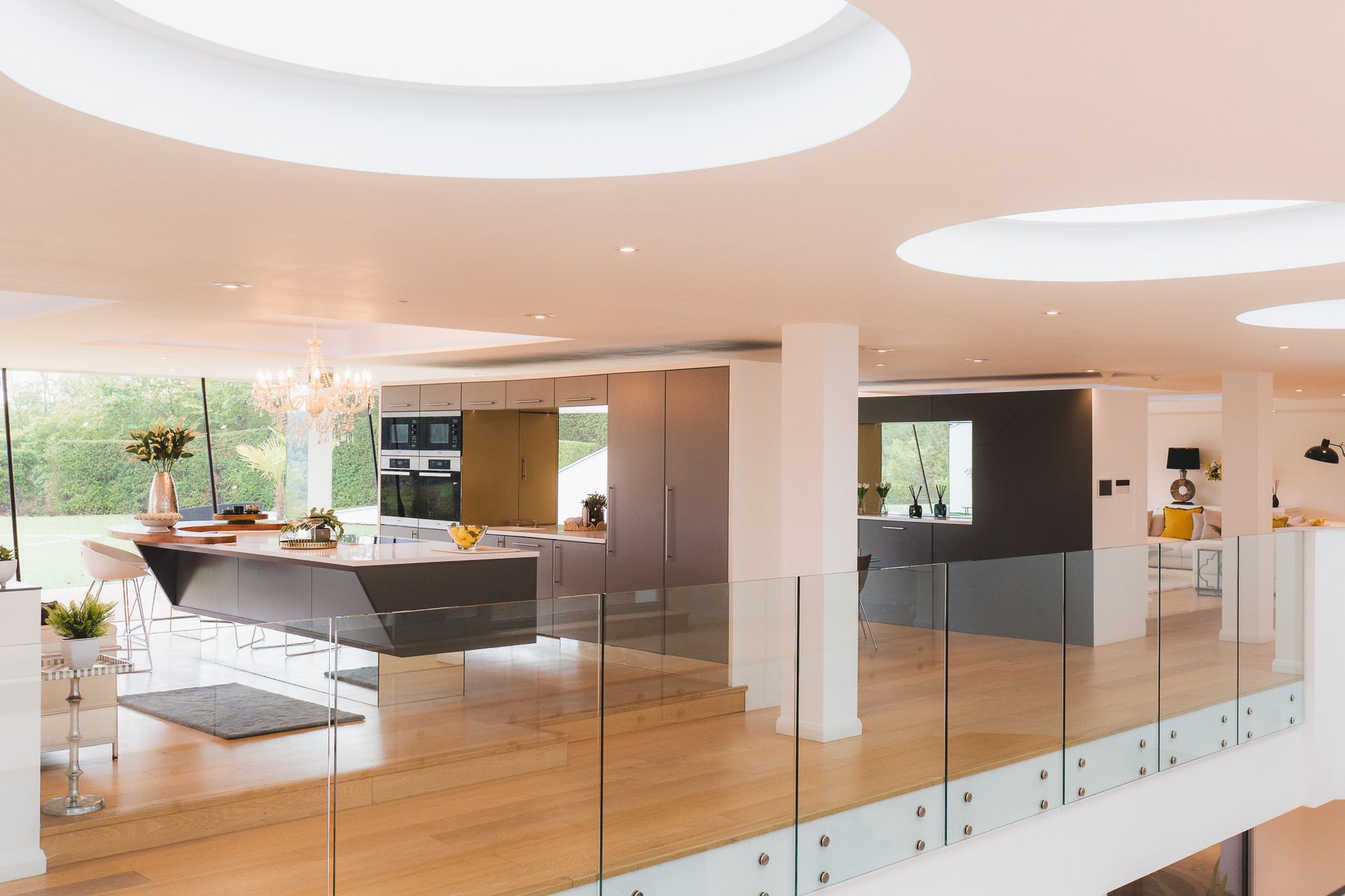 Glass balustrading sweeps through the centre of the room, beneath circling sky lights above, its white walled ends curving like the prow of a ship, guiding the eye forward and down to the entertaining heart of the home on the lower ground level below.