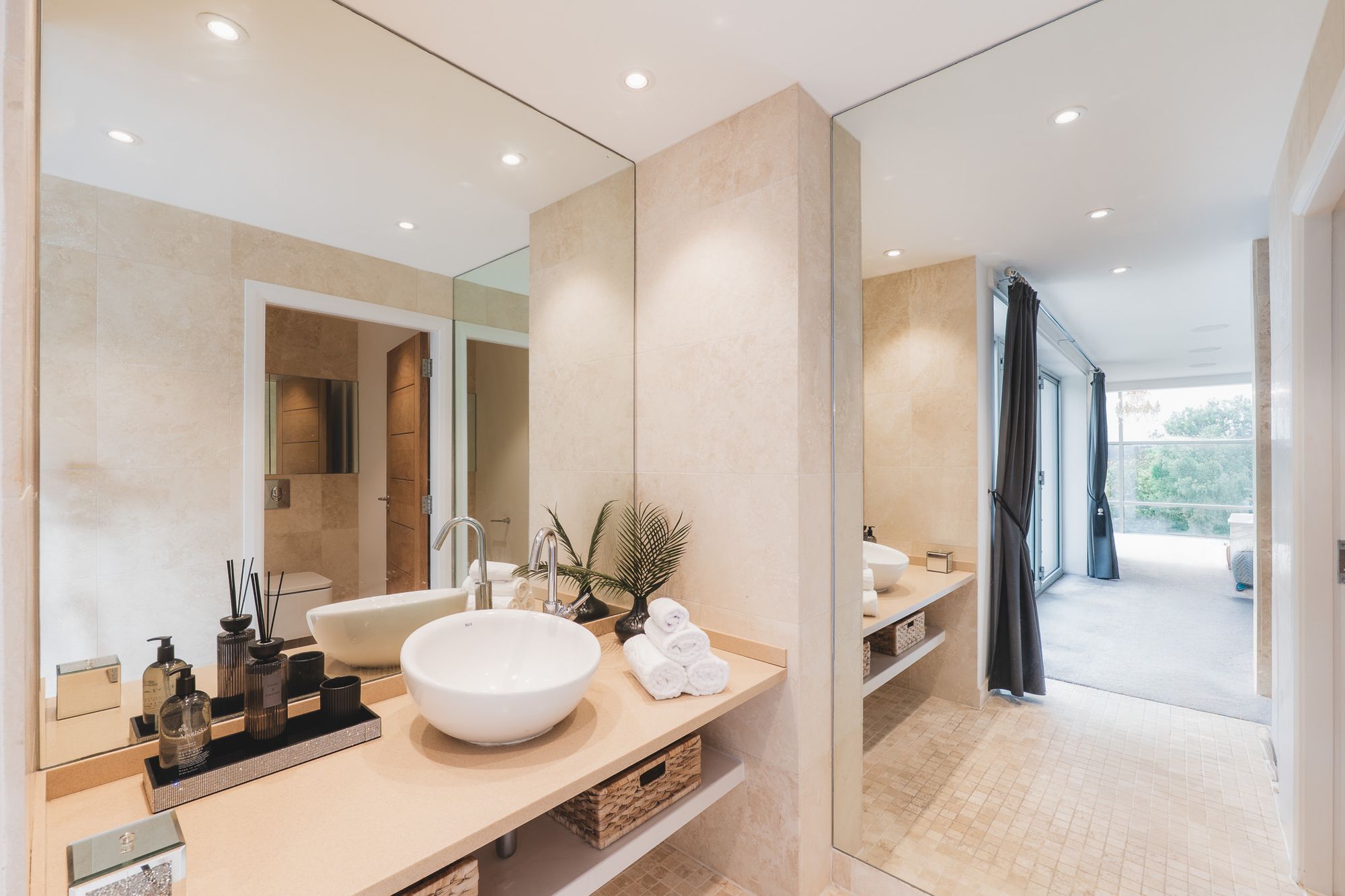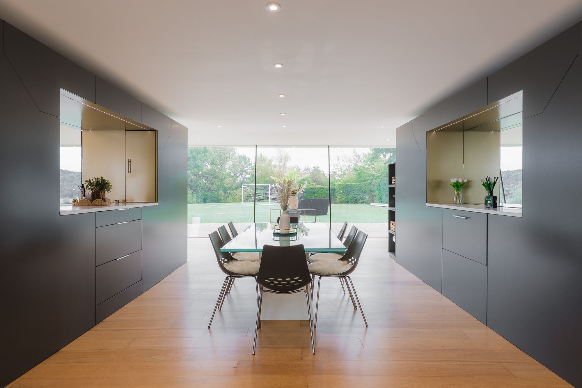 Across its main living levels - one above ground, one below - the layout of Steppingstone is fluid, open and expansive, with four distinct sitting areas and two dining zones enabling entertainment and relaxation on both floors. Technology underpins every element of life here: doors unlock by touchpad, lighting responds at a tap and integrated touchscreens bring control to every room. Entertainment is built in, with a home cinema at one end of the lounge, and HEOS speakers threaded through the living, pool and garden areas above and below, even out to the terrace where an outdoor TV extends enjoyment out into the garden.