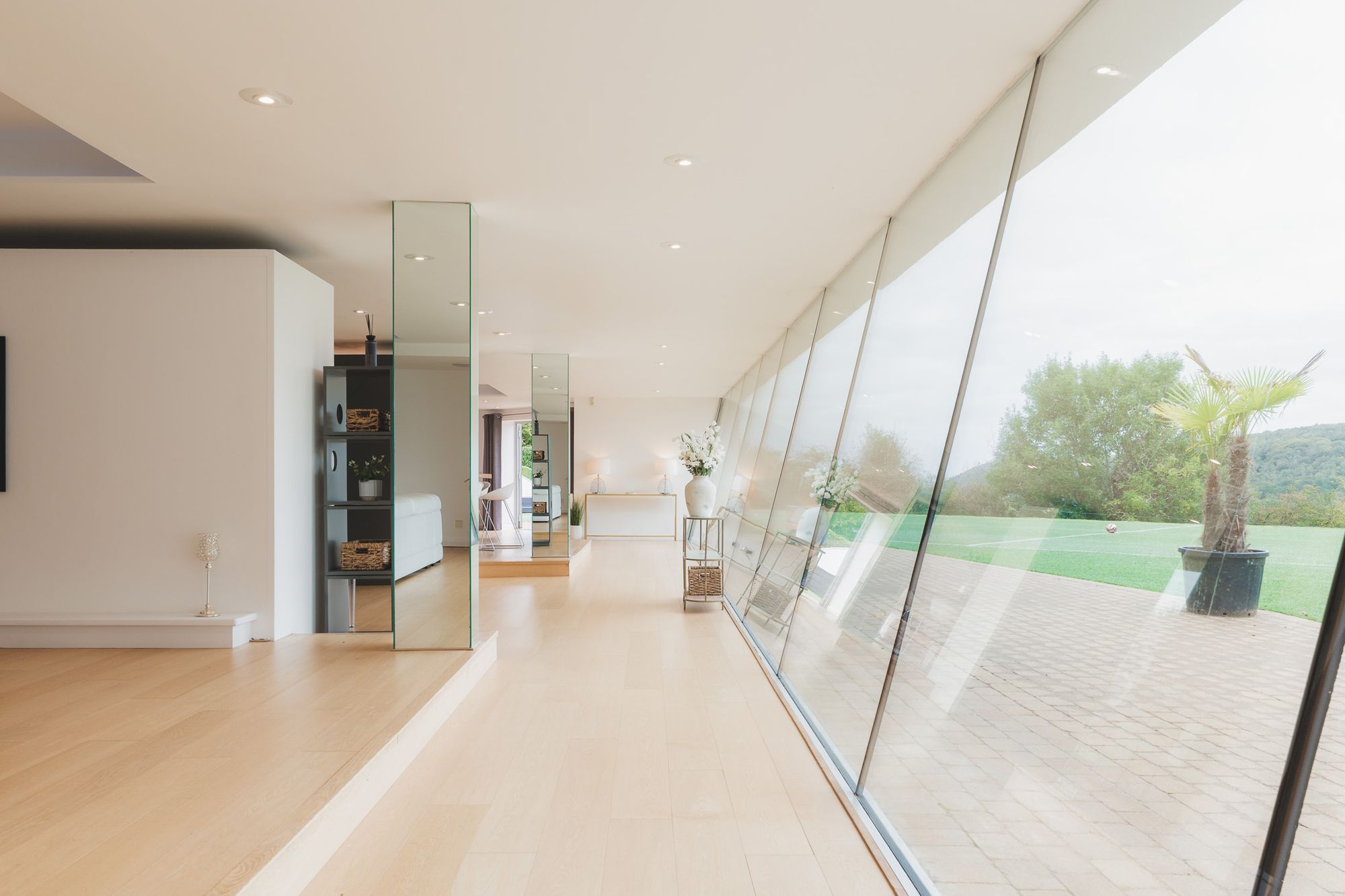 Indoors, Steppingstone’s solidity and sense of calm is profoundly felt. The curved entrance hallway sets the tone, underfloor heating providing warmth to the wood flooring throughout, mirrored pillars dividing and amplifying the space. Stairs wind up and down ahead; while curving round to the left, double doors open into the vast, open plan ground floor living area.