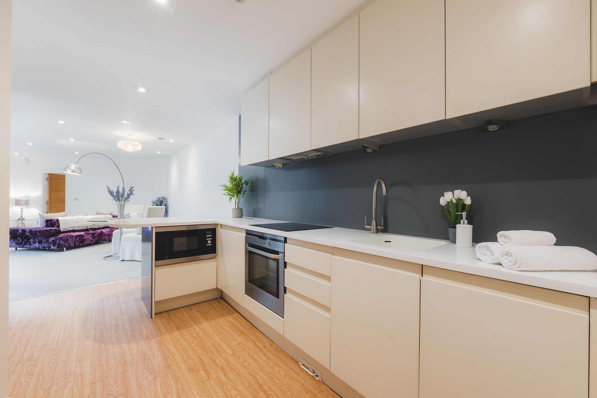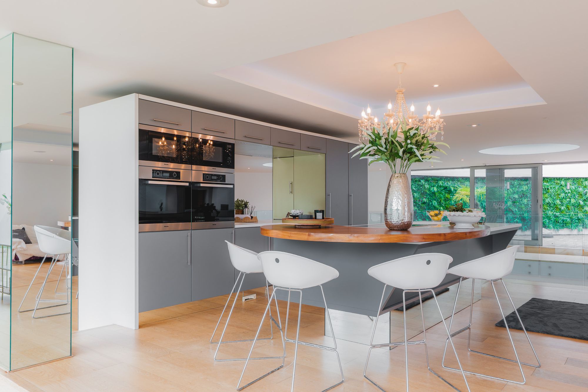 The cruise ship scale and sense of celebration seems no accident, with walls of floor to ceiling windows angled up and out on either side of this gargantuan room, where the contemporary kitchen sits to the left, separated from a snug area with wall-mounted electric fire by a low partition wall. Sleek handleless cabinetry maximises storage whilst concealing the essential appliances such as fridge and freezer, with a sociable central island breakfast bar. A bank of built-in ovens await instruction.