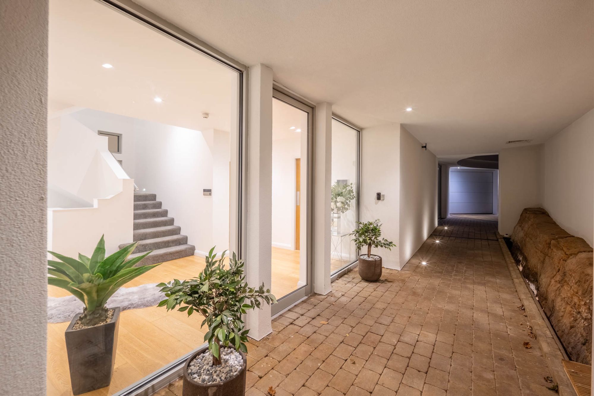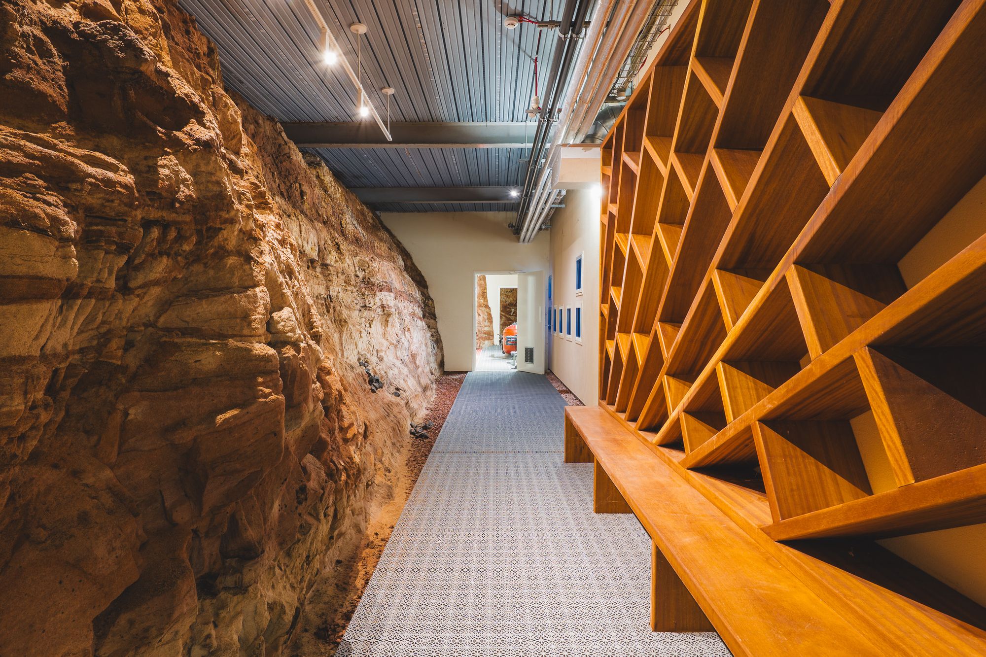 From the upper walkway, cave stairs descend down, winding between tall sandstone walls where soft lighting traces the curve and inimitable hue of the rock where the stone reveals its own history in bands and layers. A glance up reveals, in breathtaking scale, the height of the home. Along the route, glimpses appear through to the pool area and spectacular wine rack. The passage runs the full perimeter of the lower ground floor, eventually linking back to the apartment: a hidden circuit beneath the home.