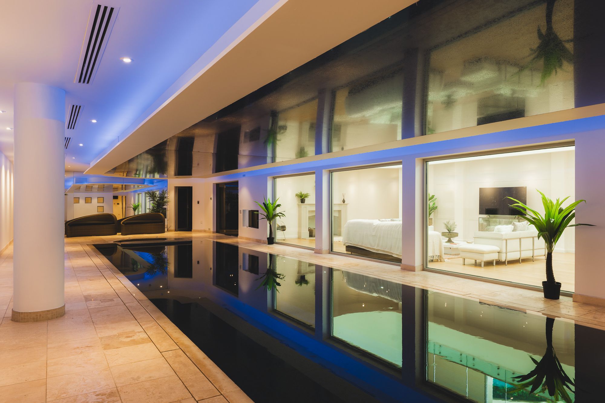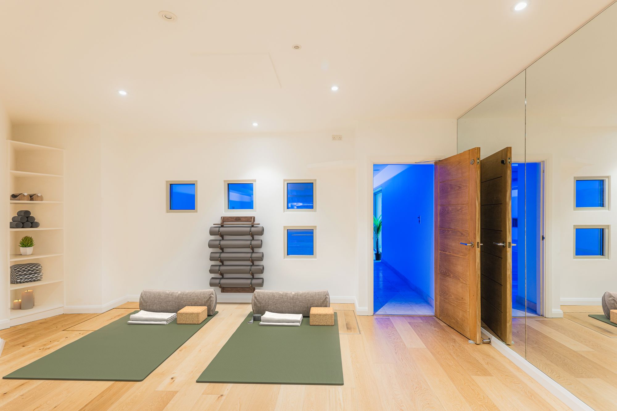 Beyond, a spacious lounge area centres around a feature fireplace, with access leading directly to the pool and, around the corner, a cloakroom, storage and yoga room.