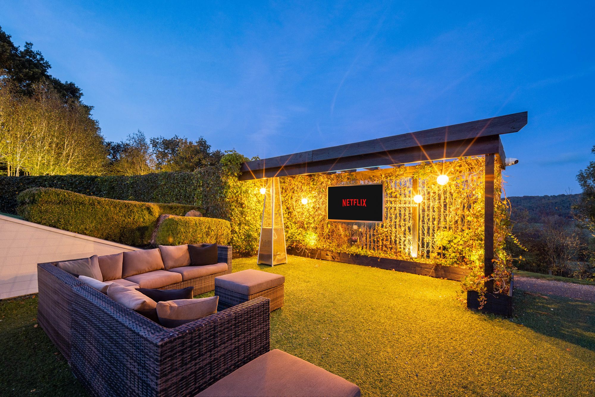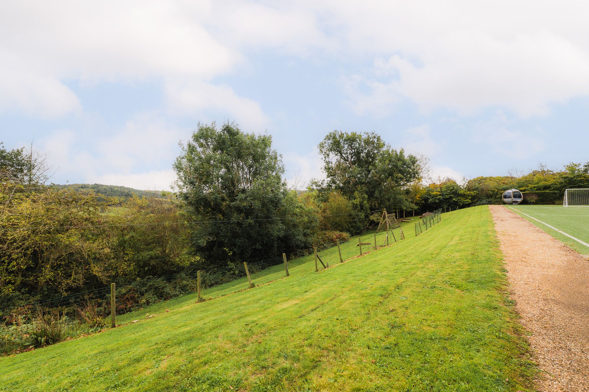 The Astroturf football pitch adds a playful twist, opening up off the kitchen snug. Soft and warm underfoot, it’s as good for barefoot lounging as for a kickabout, though it could easily become an expanse of lawn for a keen gardener. A large patio in front of here is ideal for friends to gather and unwind. Golden hour is best enjoyed at five o’clock, drink in hand, as the sun bronzes the nearby hillside. The atrium terrace forms a natural suntrap, an easy extension of the entertaining spaces and pool beyond, and a favourite summer dining spot when the warmth lingers late into the evening.
