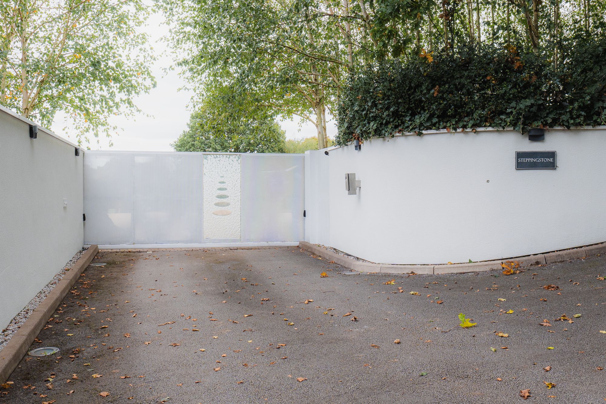 Leave the bright lights behind and travel up a leafy country lane, to find the large, white rendered walls of Steppingstone half way up the lane on the left-hand side. Electric gates open to the sweeping driveway, where parking is plentiful alongside garaging for three cars.