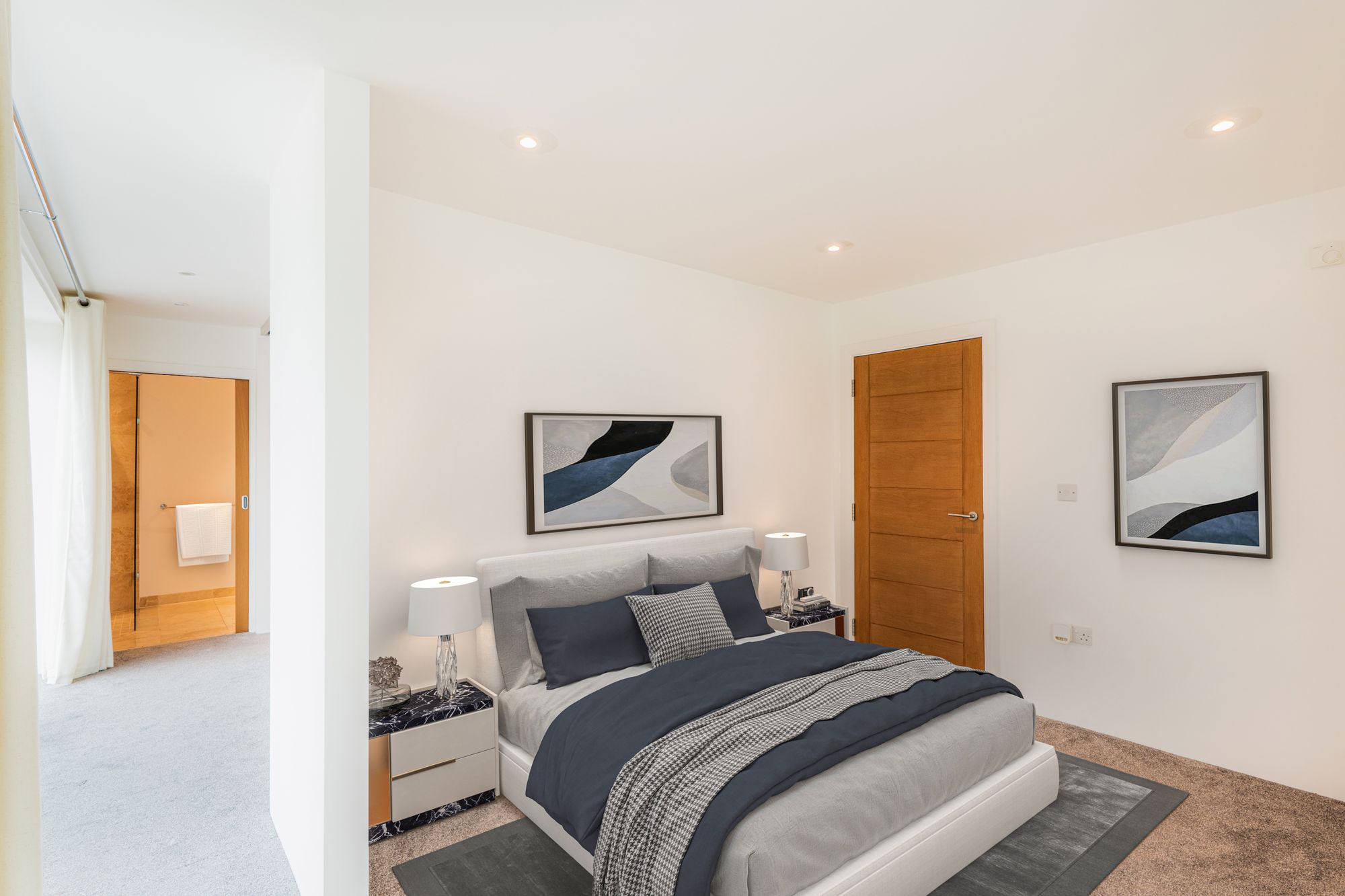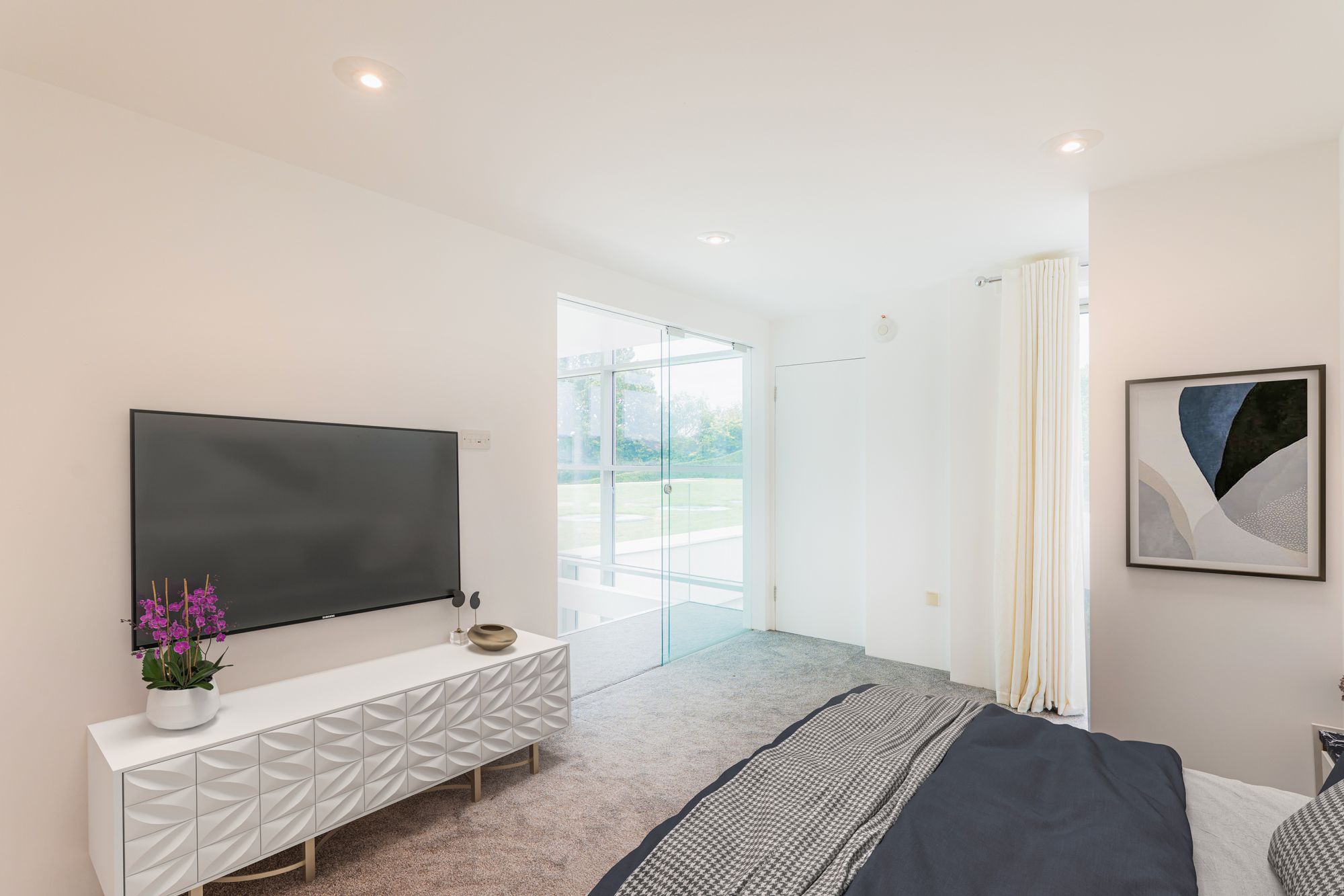And so to the master suite, a serene, glass-enveloped retreat, where the Juliet balcony draws in light and air, framing views over the top garden. To one side, a walk-in shower alcove and separate WC bring sleek functionality, while opposite the bed a built-in TV is set neatly into a wall. But true zen is to be found in the bathtub - positioned in a glazed corner of the room, sitting almost adrift in the panoramic view stretching for miles across the Cheshire countryside and local skyline. Soak and become part of the landscape, as the mists rise over the undulating fields on autumn mornings.