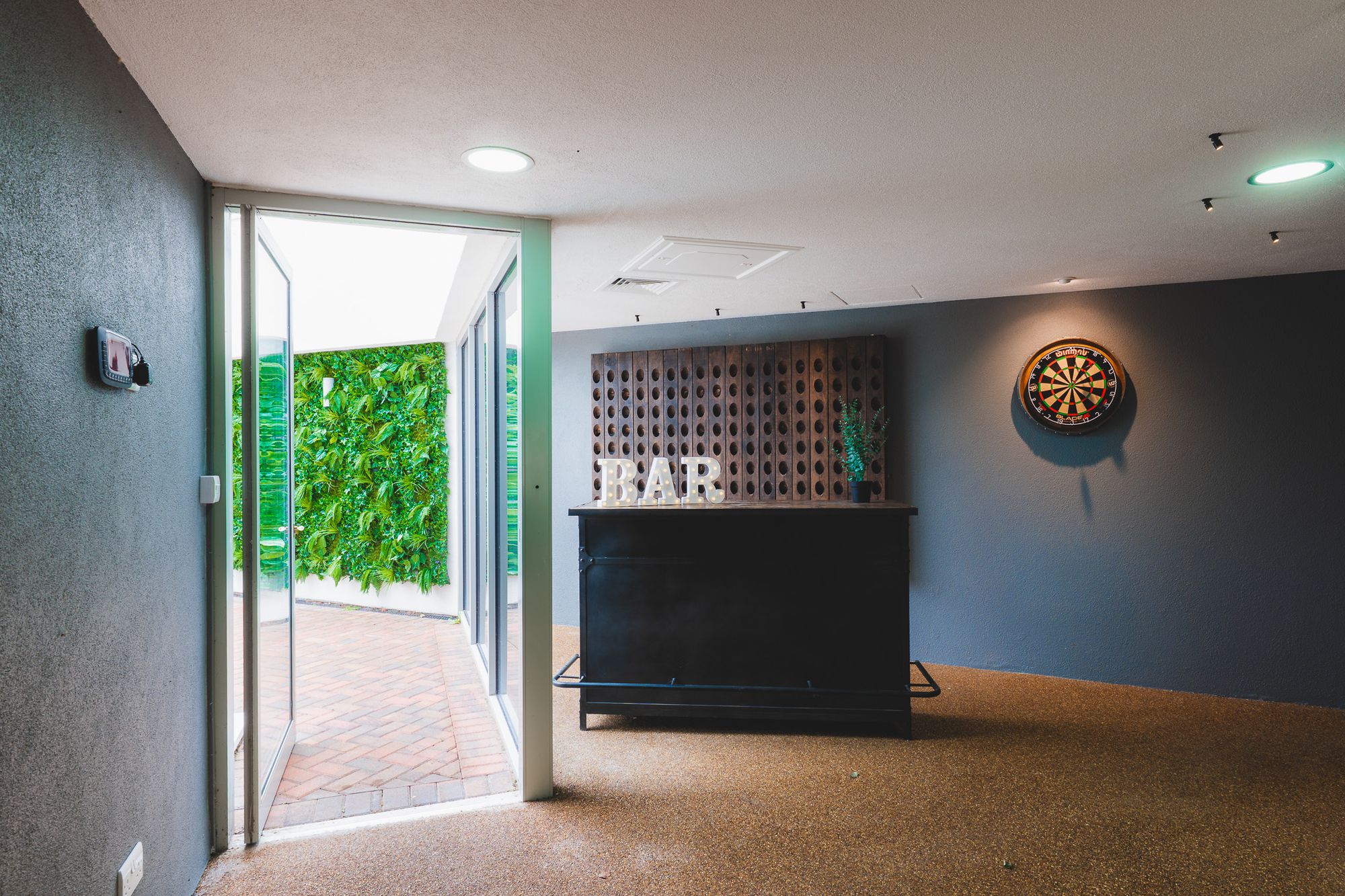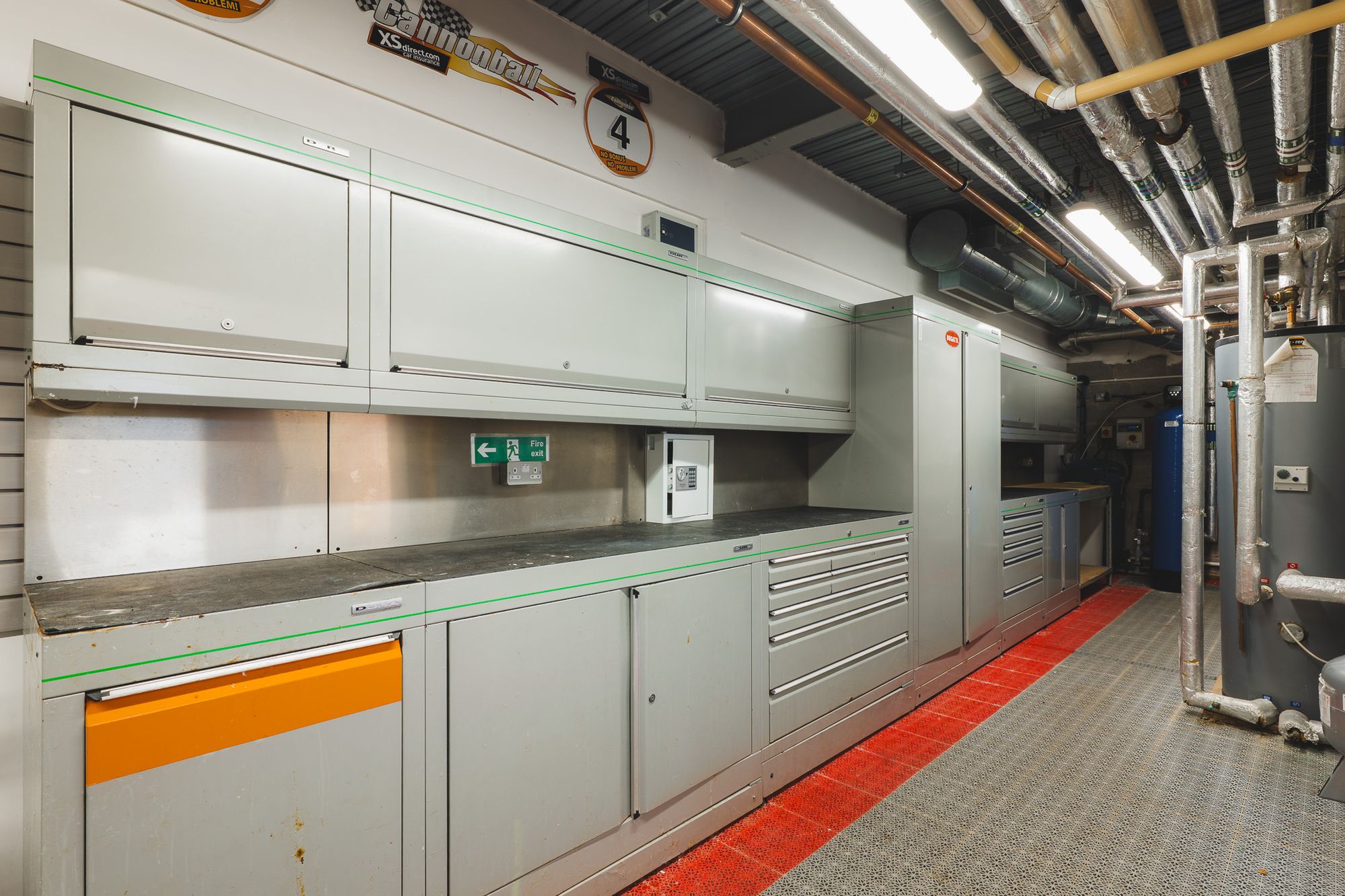 Tucked off to one side of the open plan entertaining and relaxation space is a WC with wash basin, and a comms room with plenty of storage and built-in desk with space for a monitor to watch the comings and goings.
