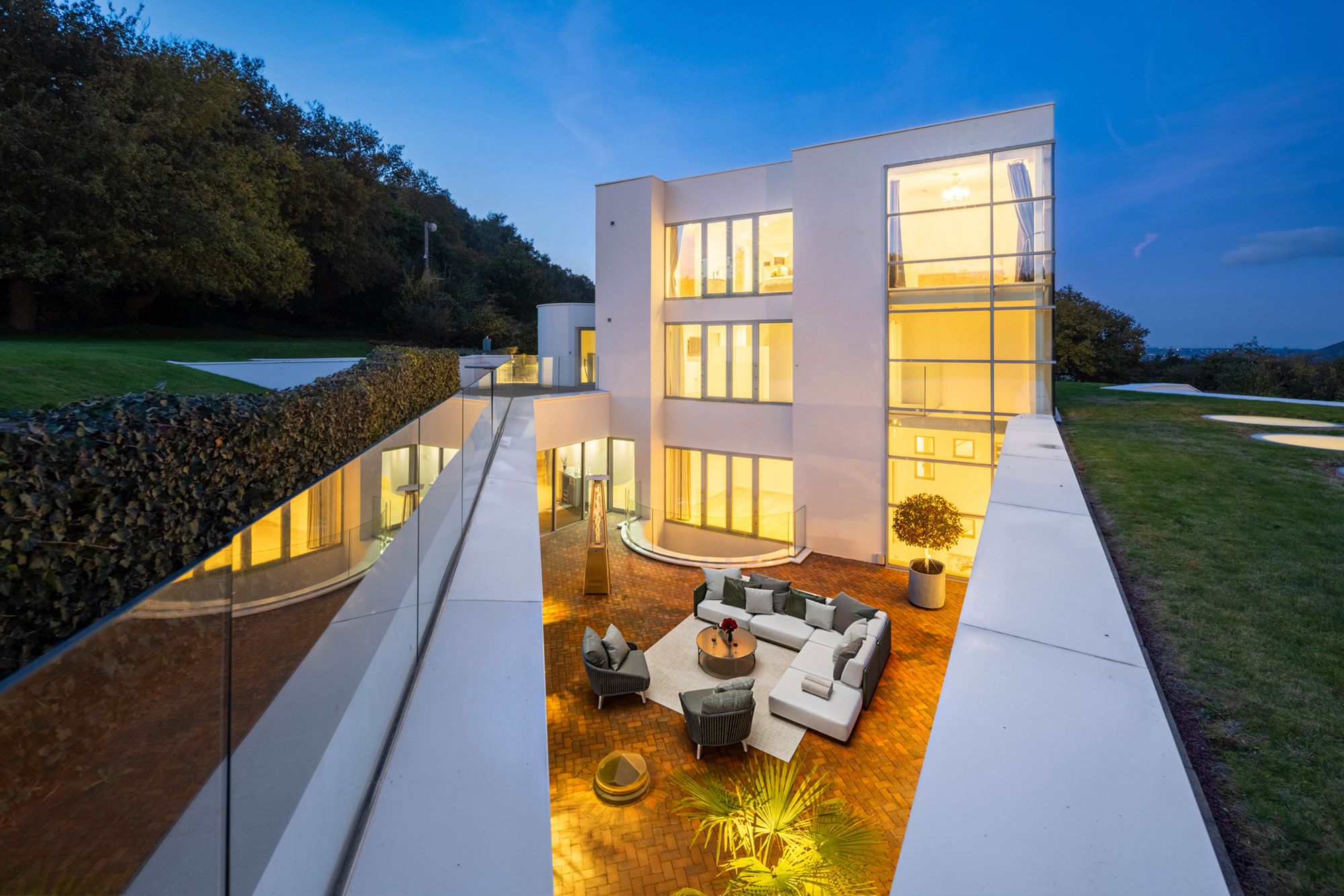 The Astroturf football pitch adds a playful twist, opening up off the kitchen snug. Soft and warm underfoot, it’s as good for barefoot lounging as for a kickabout, though it could easily become an expanse of lawn for a keen gardener. A large patio in front of here is ideal for friends to gather and unwind. Golden hour is best enjoyed at five o’clock, drink in hand, as the sun bronzes the nearby hillside. The atrium terrace forms a natural suntrap, an easy extension of the entertaining spaces and pool beyond, and a favourite summer dining spot when the warmth lingers late into the evening.