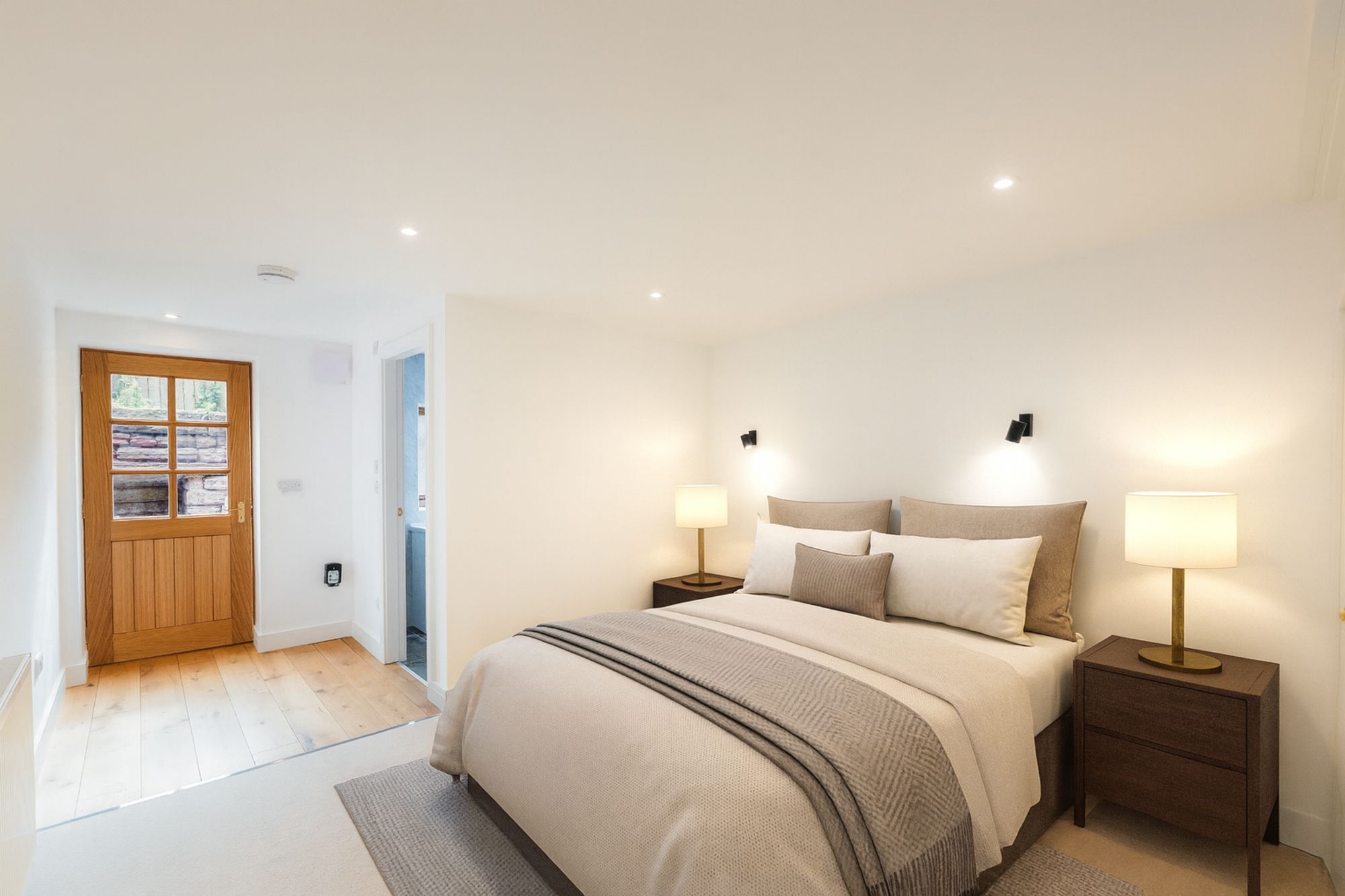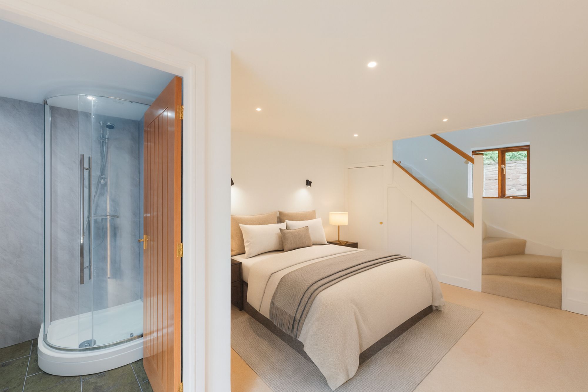 A half glazed oak door draws light through into the ground-floor bedroom, a restful retreat where thick sandstone walls keep a constant ambient temperature. Beneath the stairs, a cleverly enclosed alcove offers space for a neat and discreet fitted wardrobe & dresser.