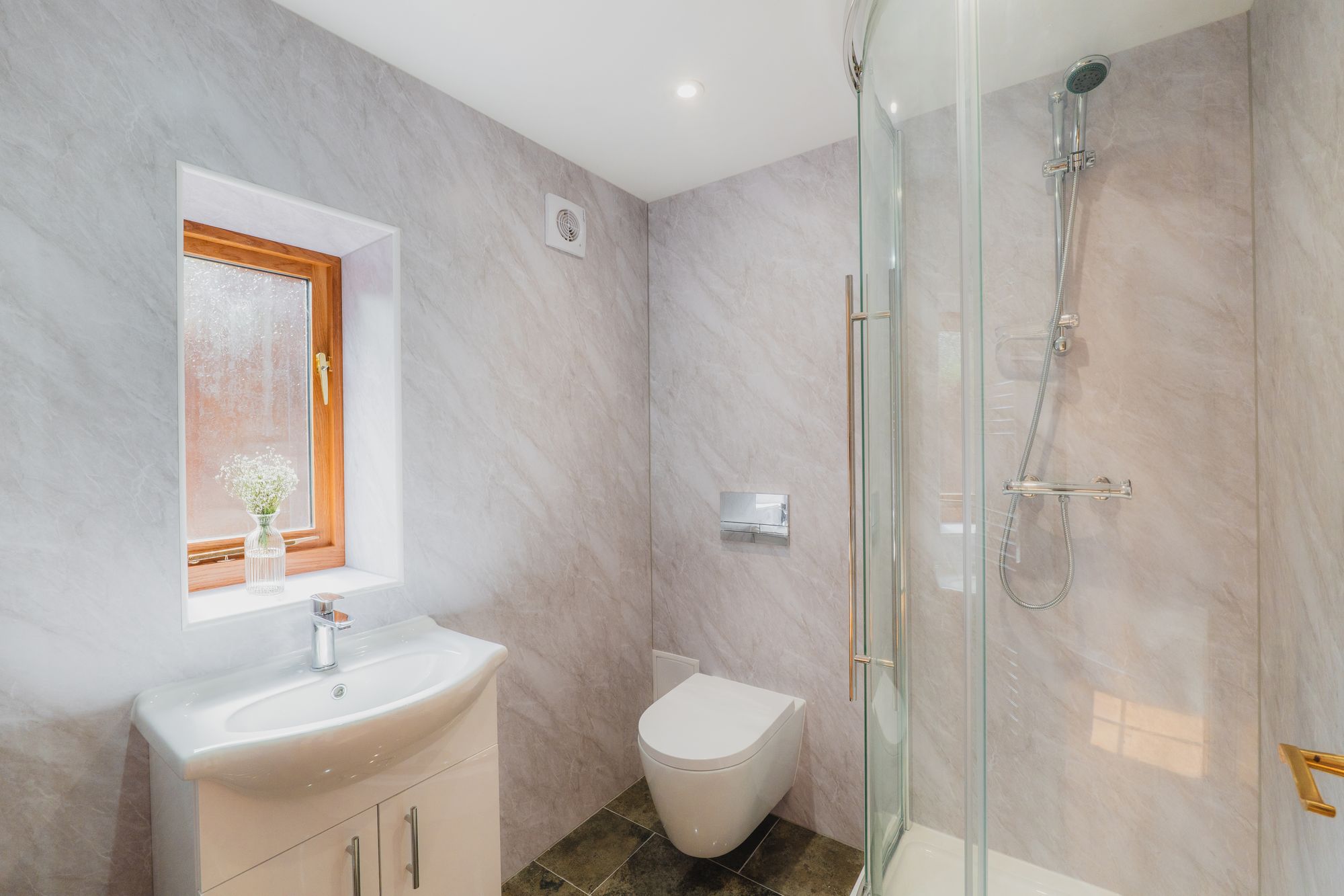 Freshen up in the en suite shower room, finished in smooth marble-effect panels, warm oak-framed window and heated towel rail.