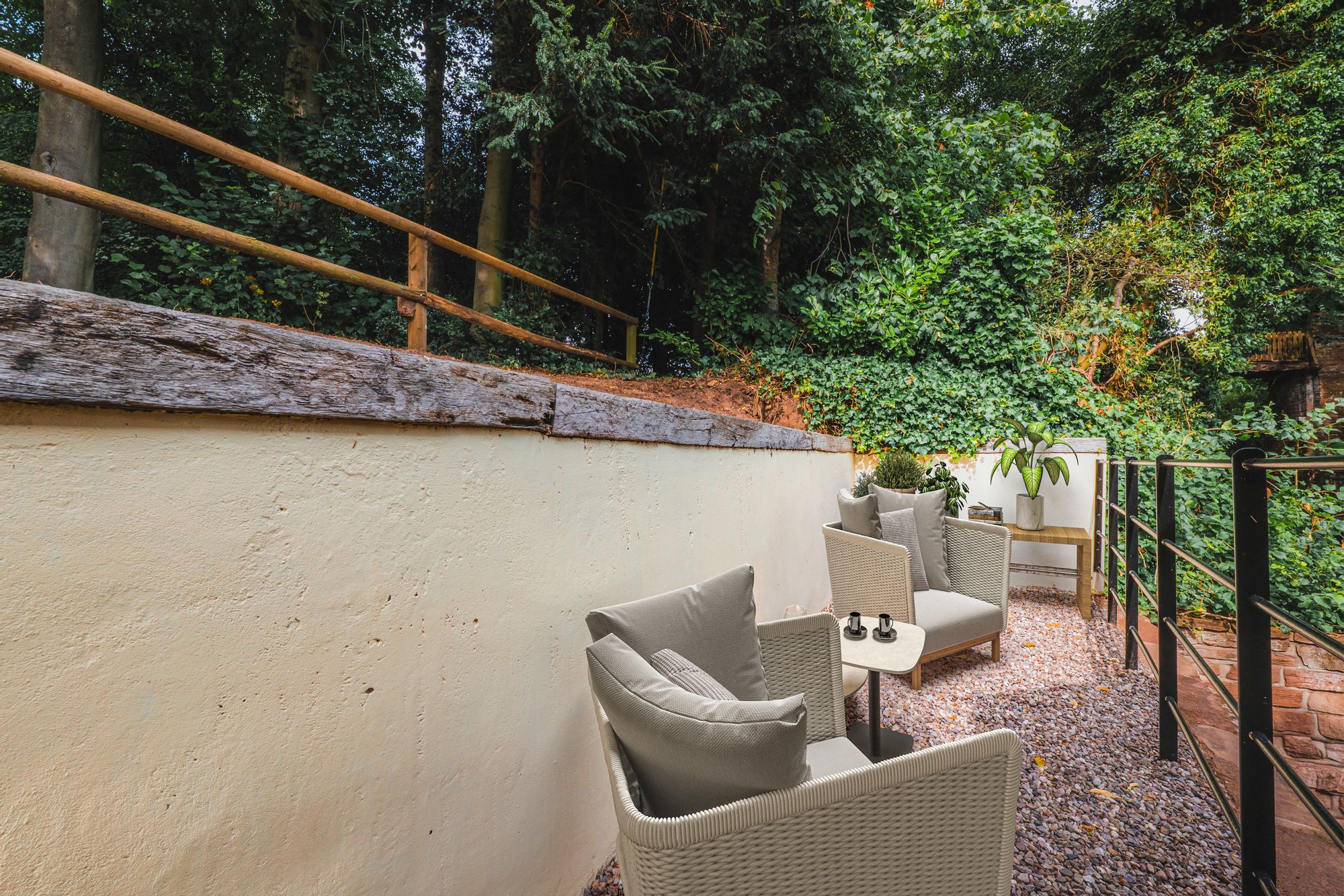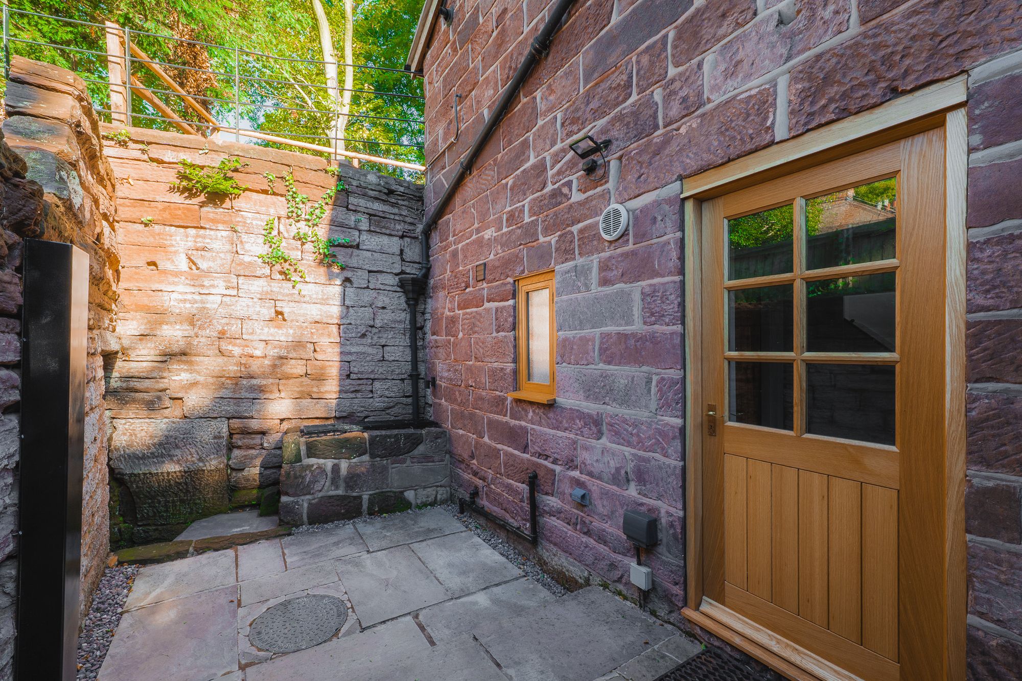 Step through the wooden gate from Forest Road into a small private courtyard enclosed by tall, honeyed sandstone walls, where, in one corner, a well – safely covered by an iron grid – echoes the building’s 19th-century working life, illuminated at night to provide a gentle, theatrical glow.