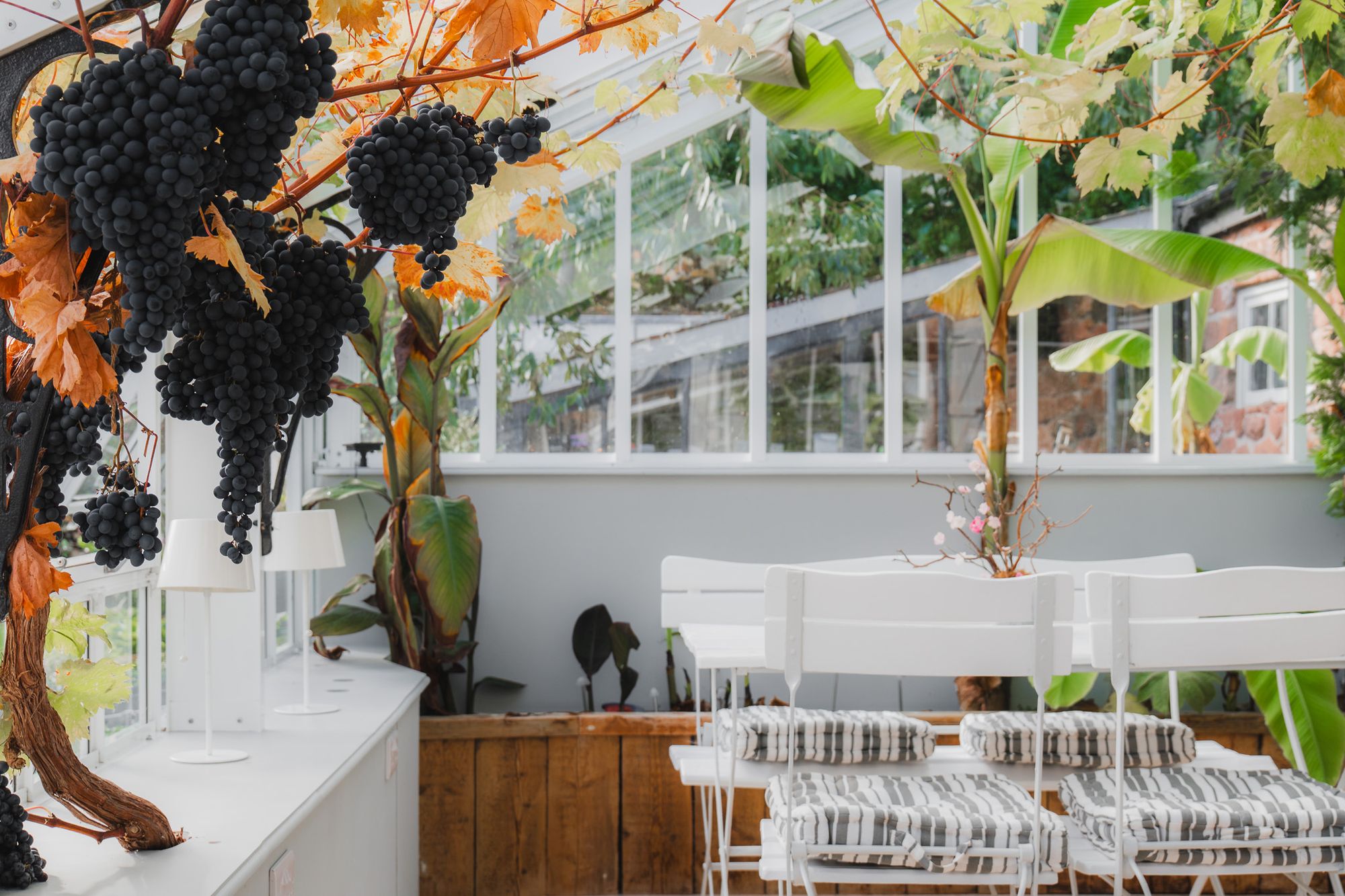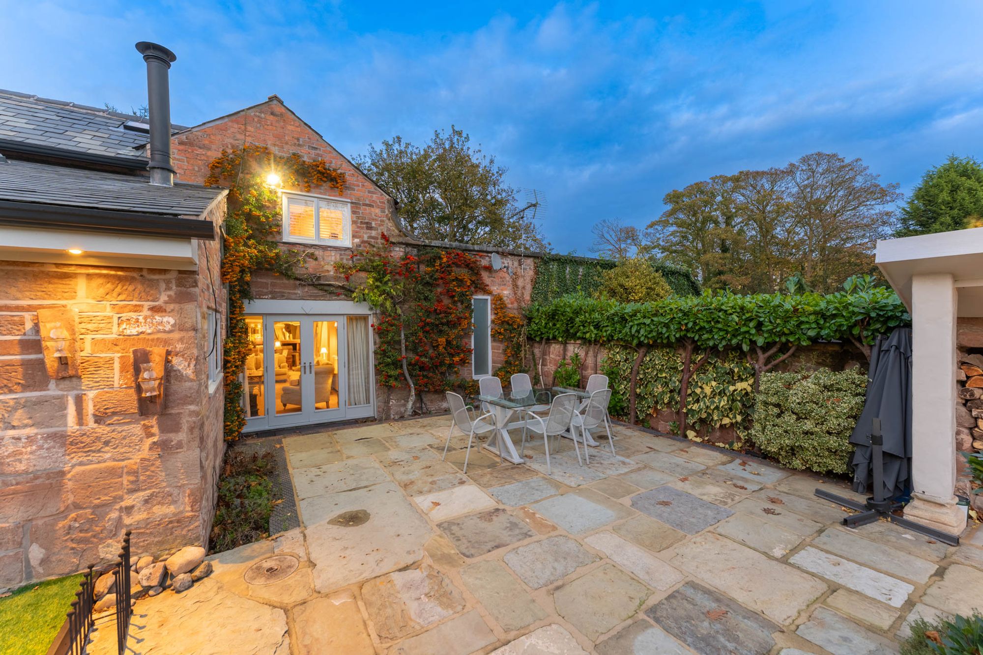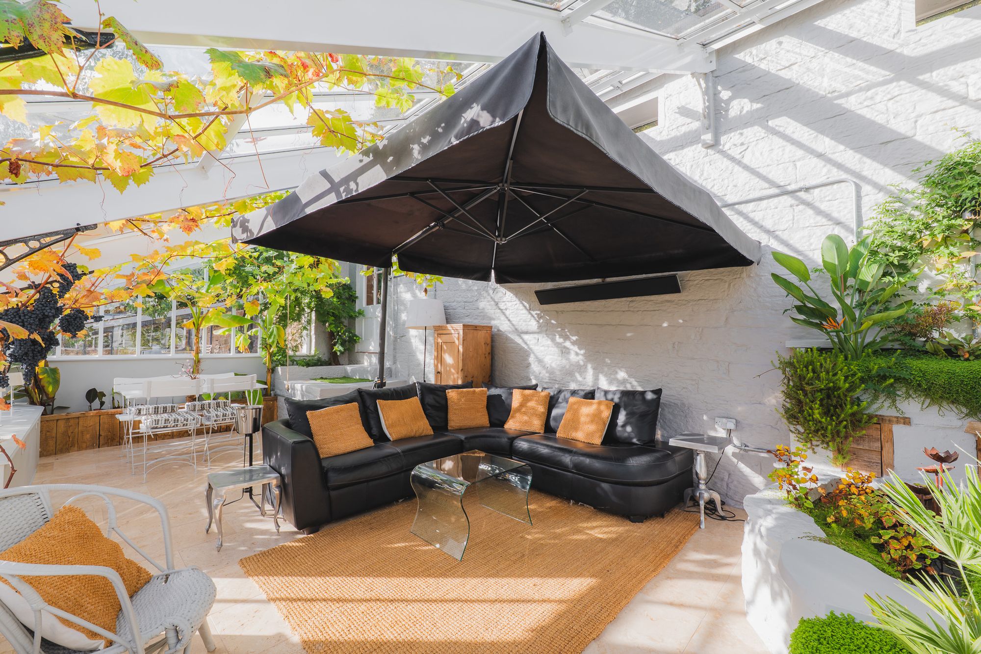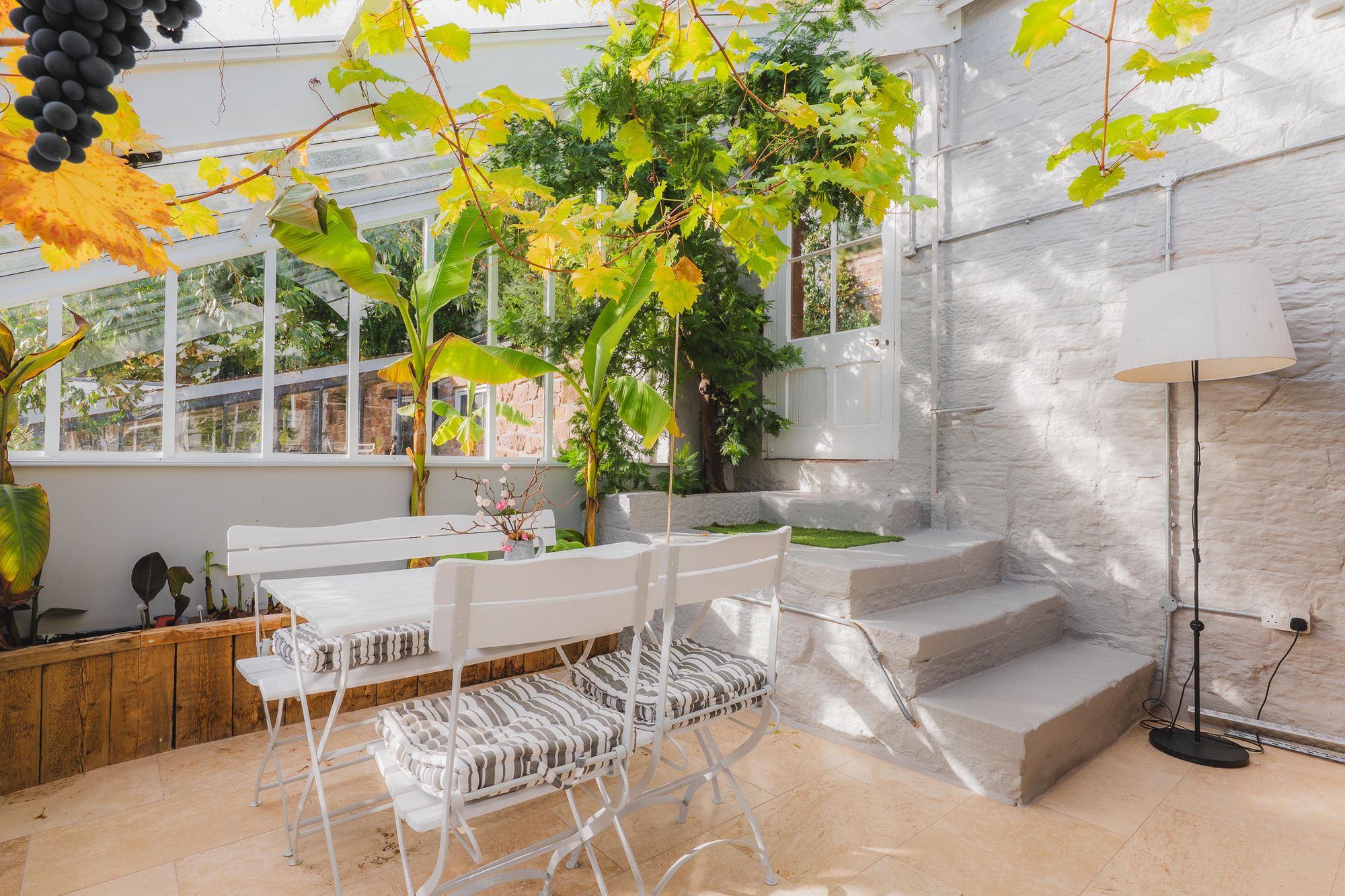 Beyond, the flow of The Bothy continues, stepping up to the rediscovered Victorian glasshouse. With full height glazing and a glass ceiling, the room marks a beautiful transition between home and garden, where banana plants and vines laden with grapes climb the glass during hot seasons. In summer, the warmth gathers beneath the glass, making it an enchanting sanctuary in which to dine or unwind as evening falls. A tranquil water feature keeps the air moist, just as it would have been in its Victorian heyday. With the parasol heater on, looking out over the courtyard beyond, surrounded by greenery and grapes, the experience is magical.