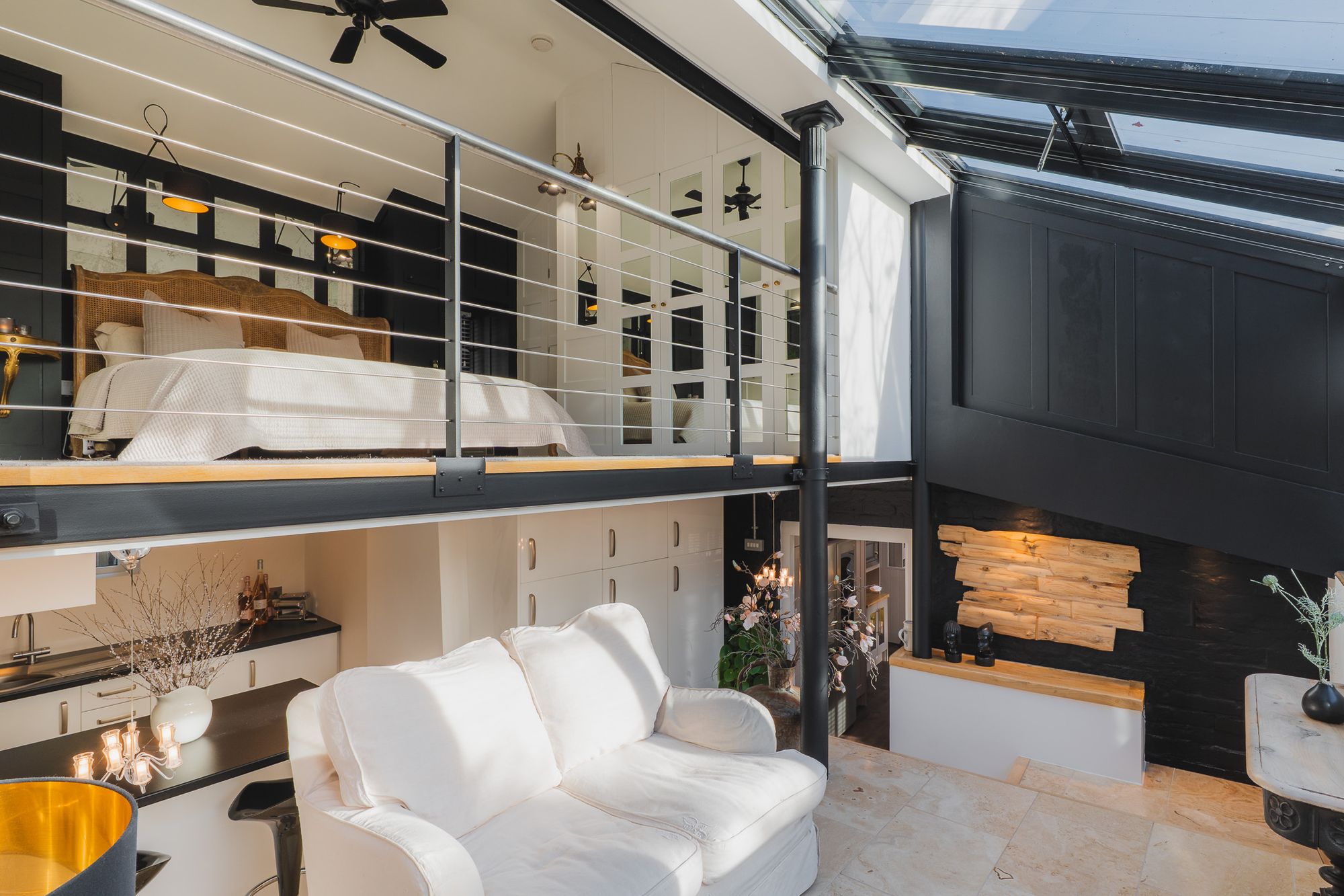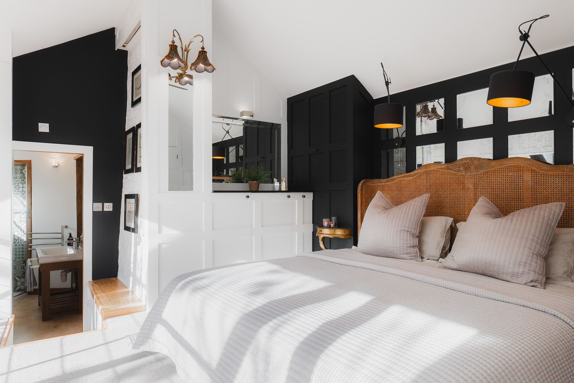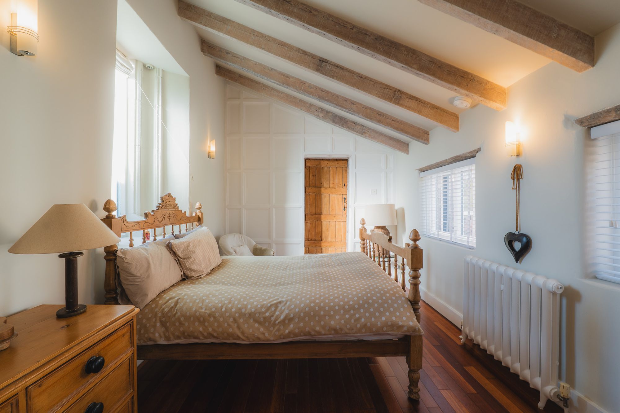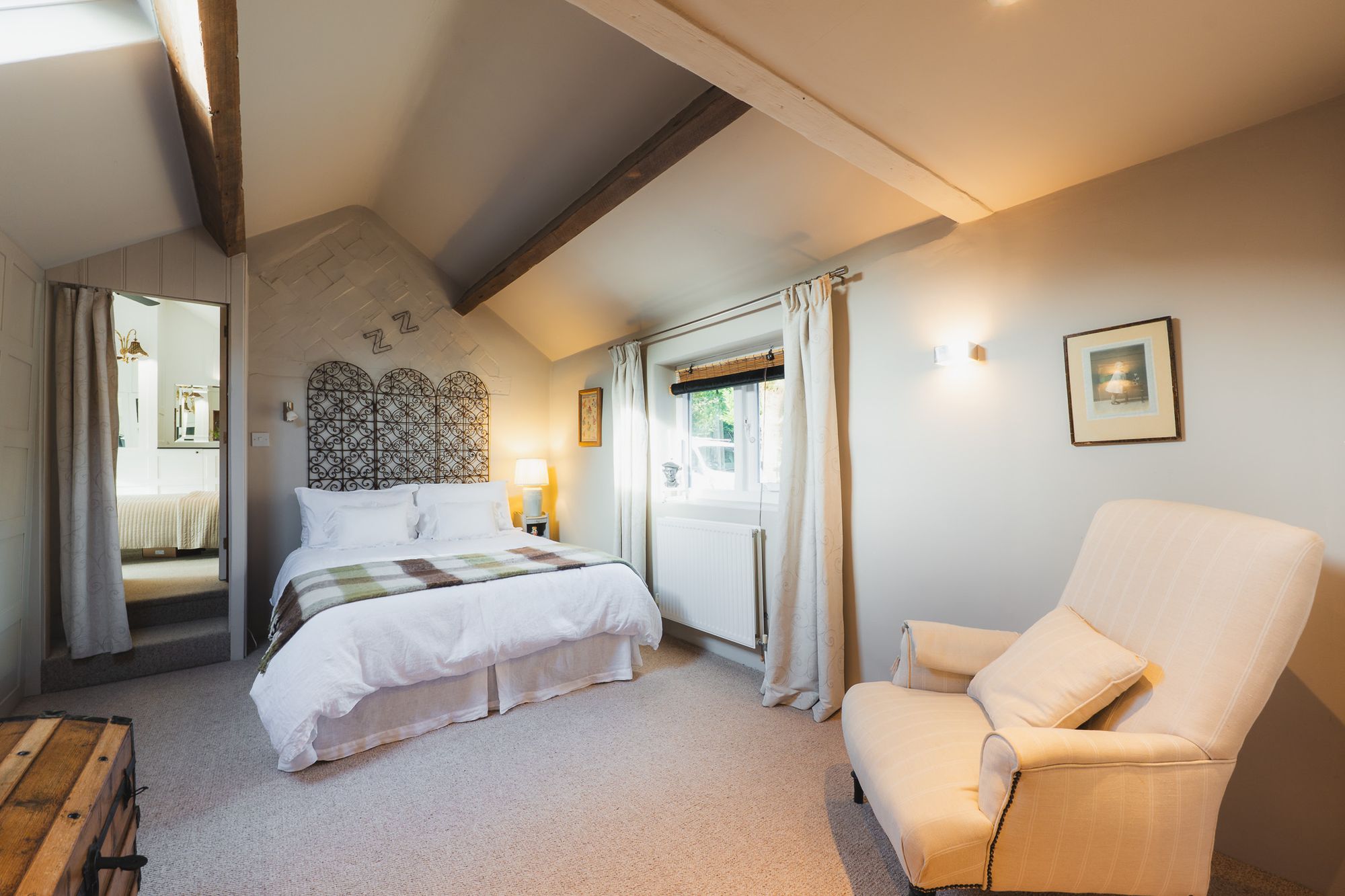 Light streams through, while, to the right, an opaque glass door opens into the family bathroom that pairs rustic beams and exposed stone with a freestanding oval bath and walk-in shower, for a medley of old and new.