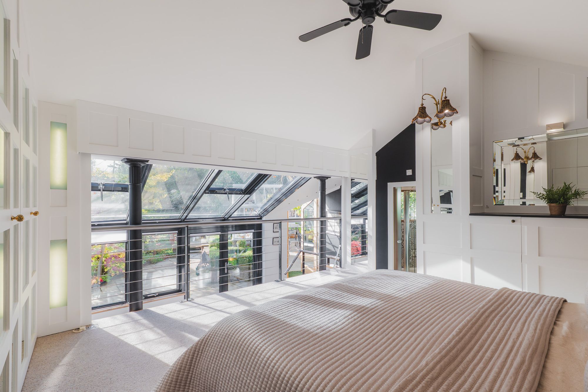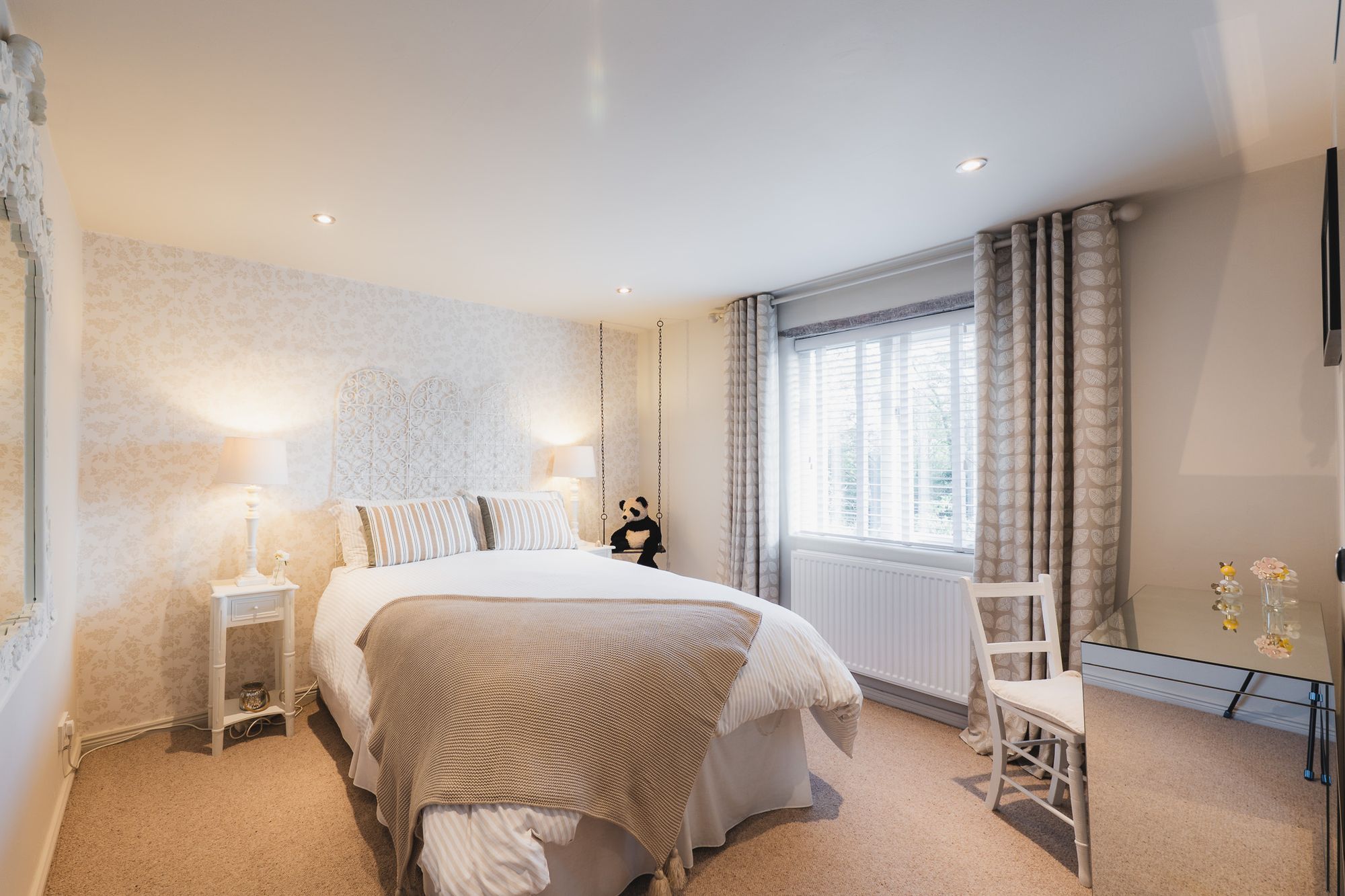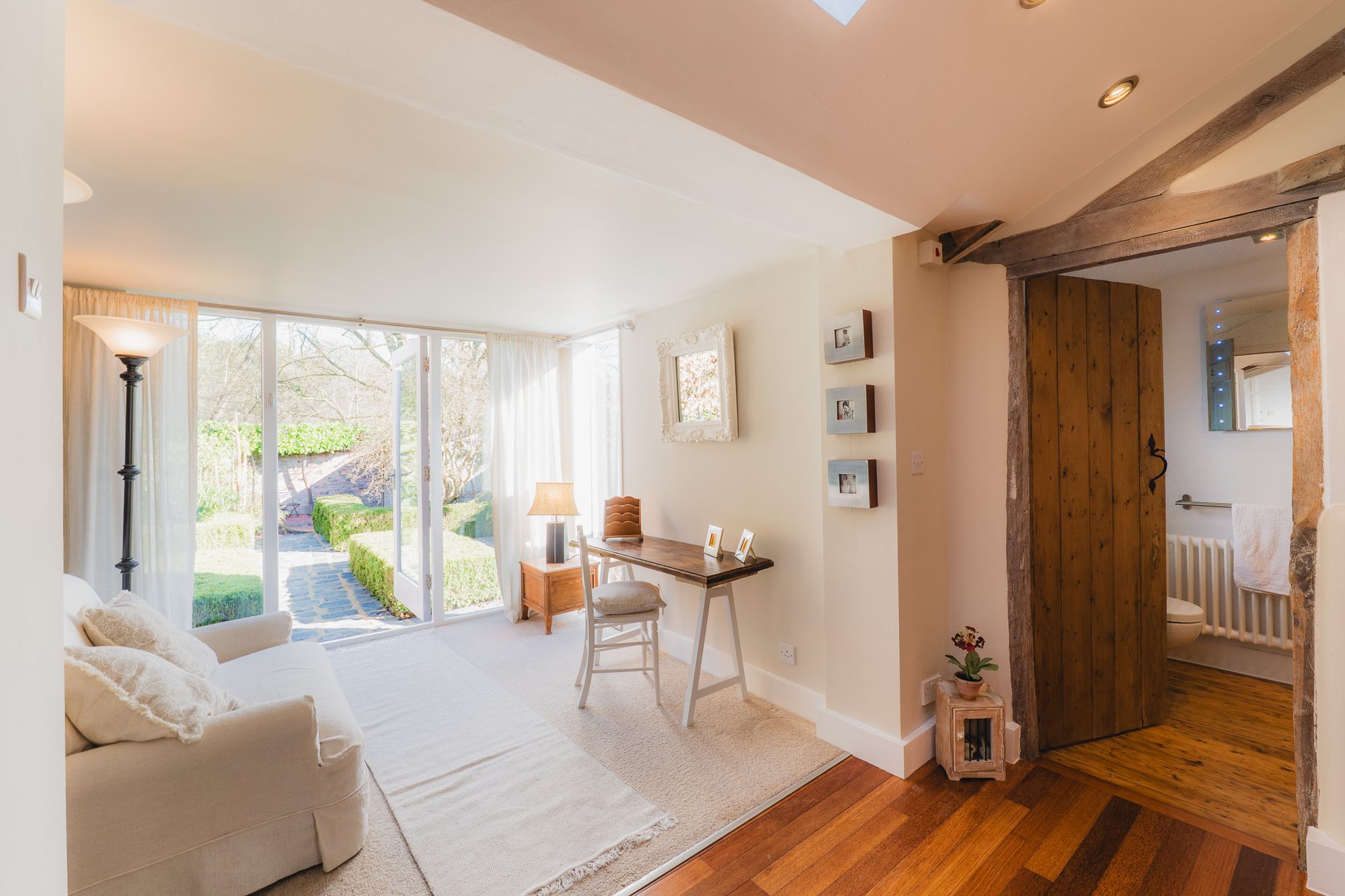 A sleek, contemporary en suite enhances comfort, while large glazed doors draw in an abundance of natural light and open directly onto the courtyard. This tranquil outdoor space becomes a seamless extension of the room, perfect for a quiet morning coffee or moments of relaxation.