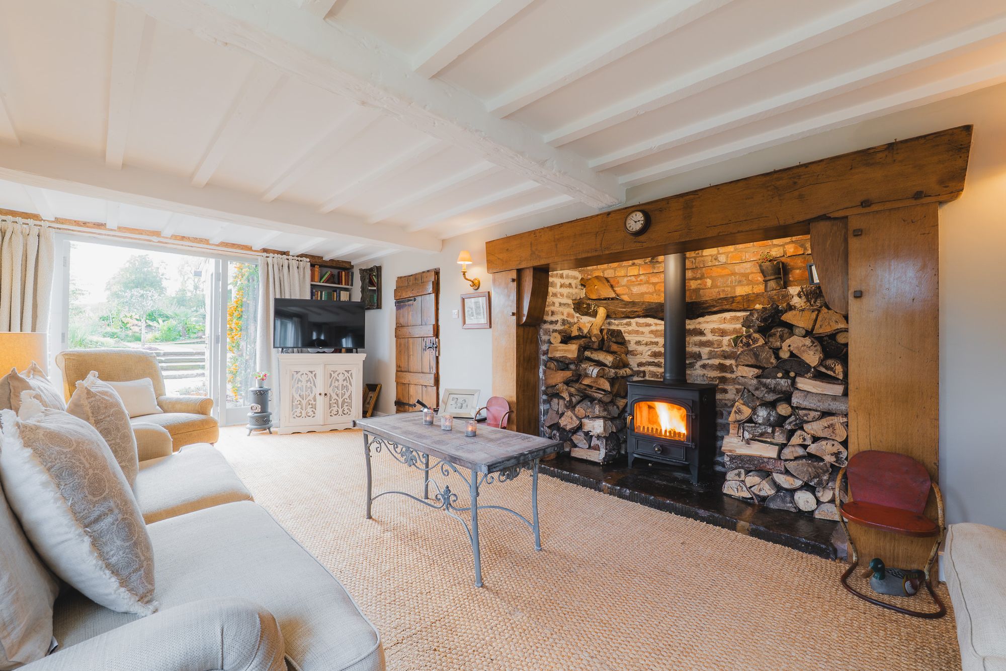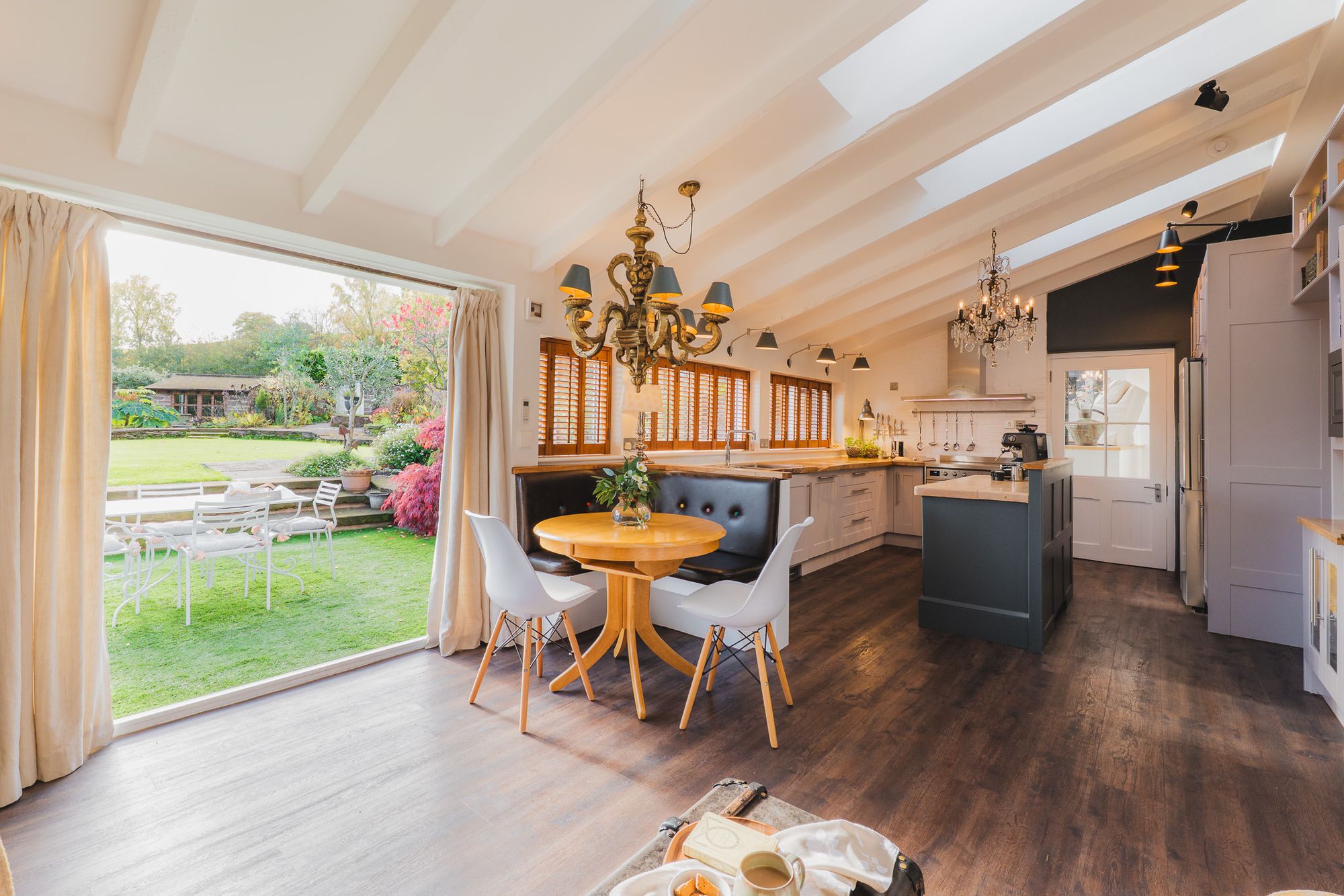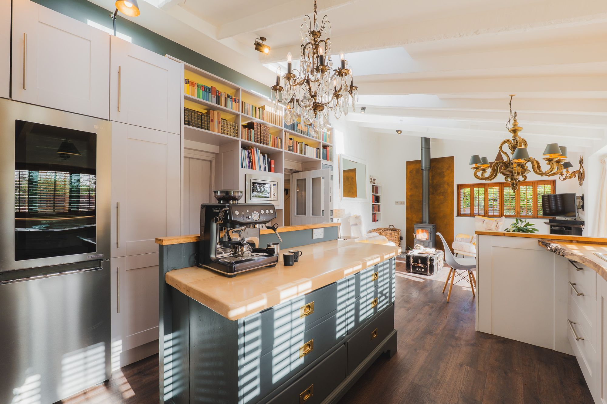 A leather banquette is wipe down and perfectly practical for family meals and jam-fingered breakfasts for all ages. The Clearview exposed flue log burner infuses warmth, while a host of Smeg appliances are seamlessly built in, including: a double oven with induction hob, inset deep-fat fryer, microwave, dishwasher and an instant boiling Quooker tap. A sociable hub, this room connects seamlessly with the outdoors and in and has played host to numerous parties.