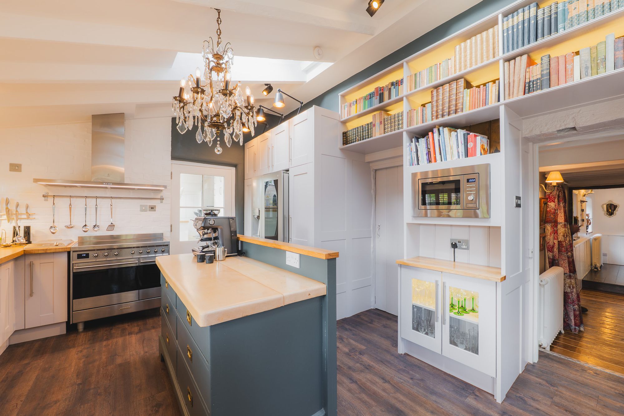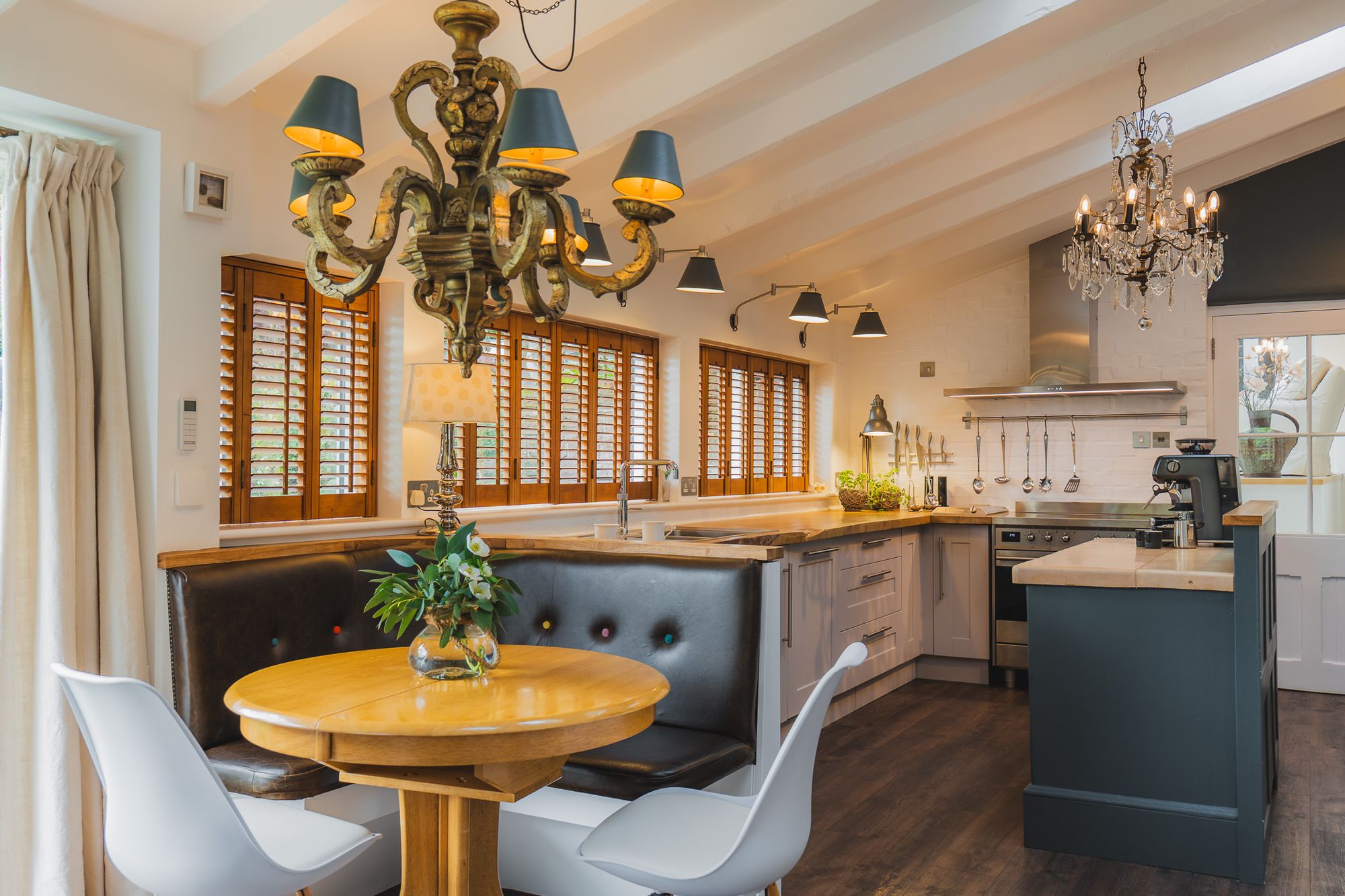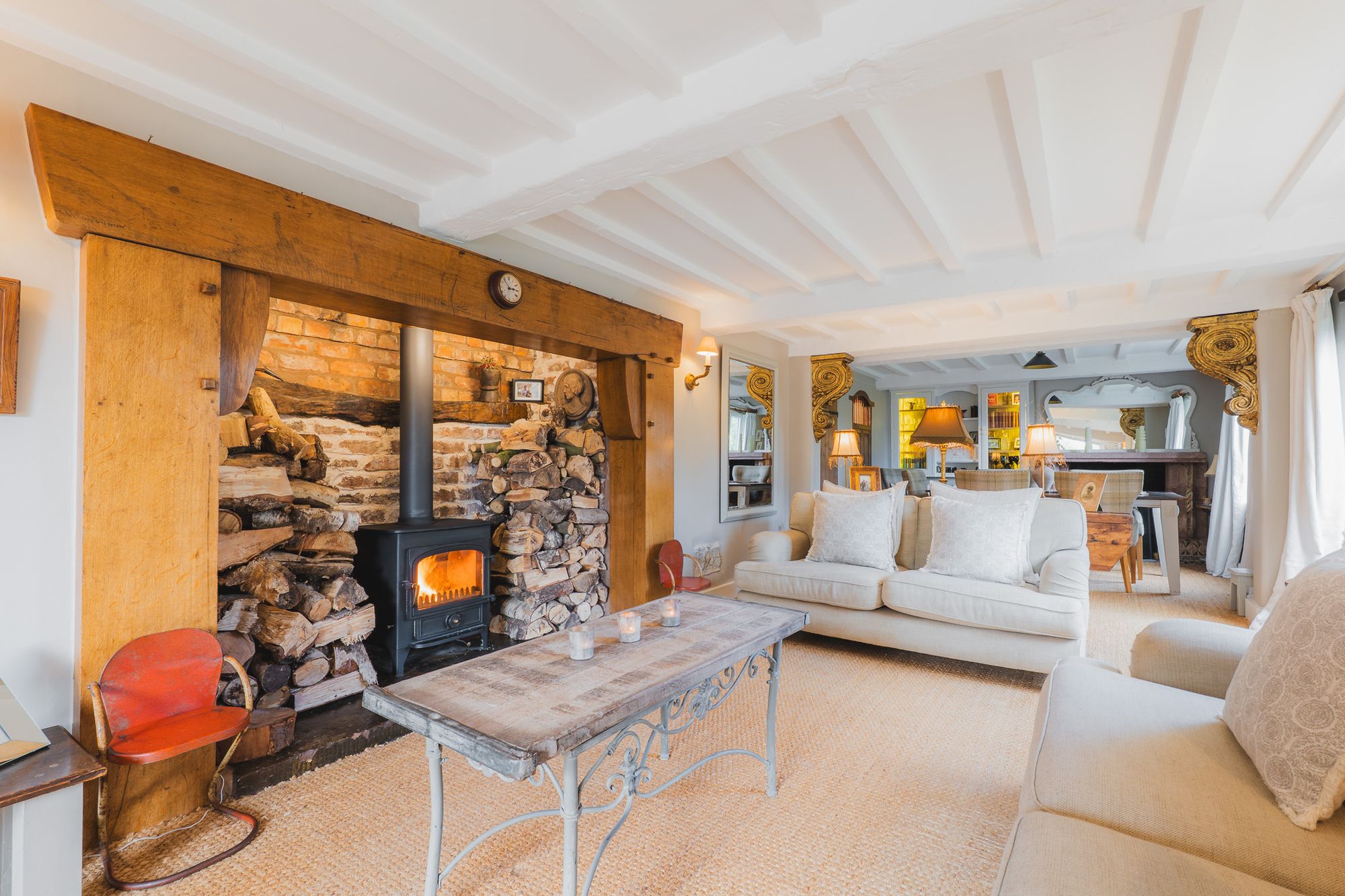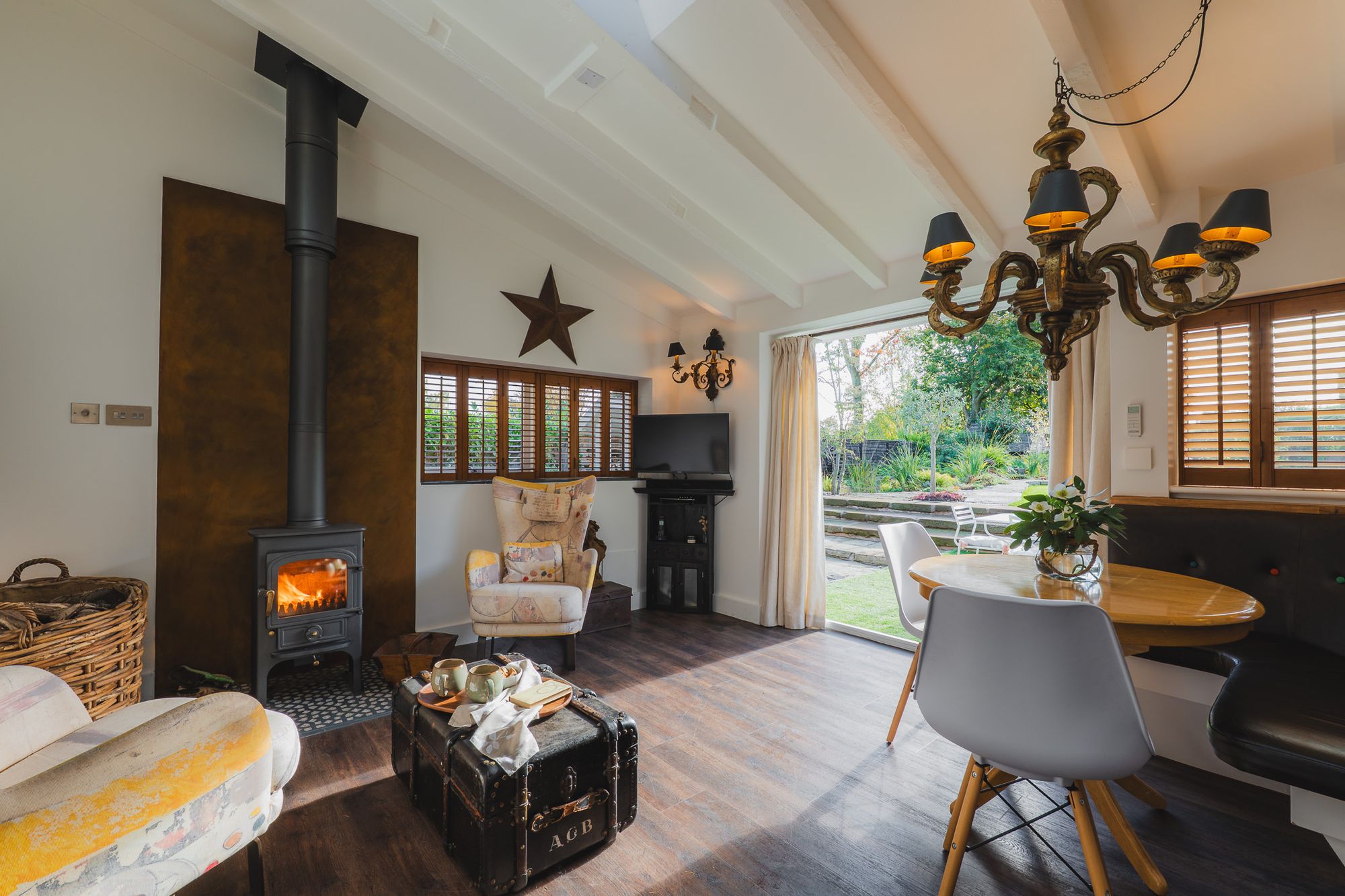 A leather banquette is wipe down and perfectly practical for family meals and jam-fingered breakfasts for all ages. The Clearview exposed flue log burner infuses warmth, while a host of Smeg appliances are seamlessly built in, including: a double oven with induction hob, inset deep-fat fryer, microwave, dishwasher and an instant boiling Quooker tap. A sociable hub, this room connects seamlessly with the outdoors and in and has played host to numerous parties.