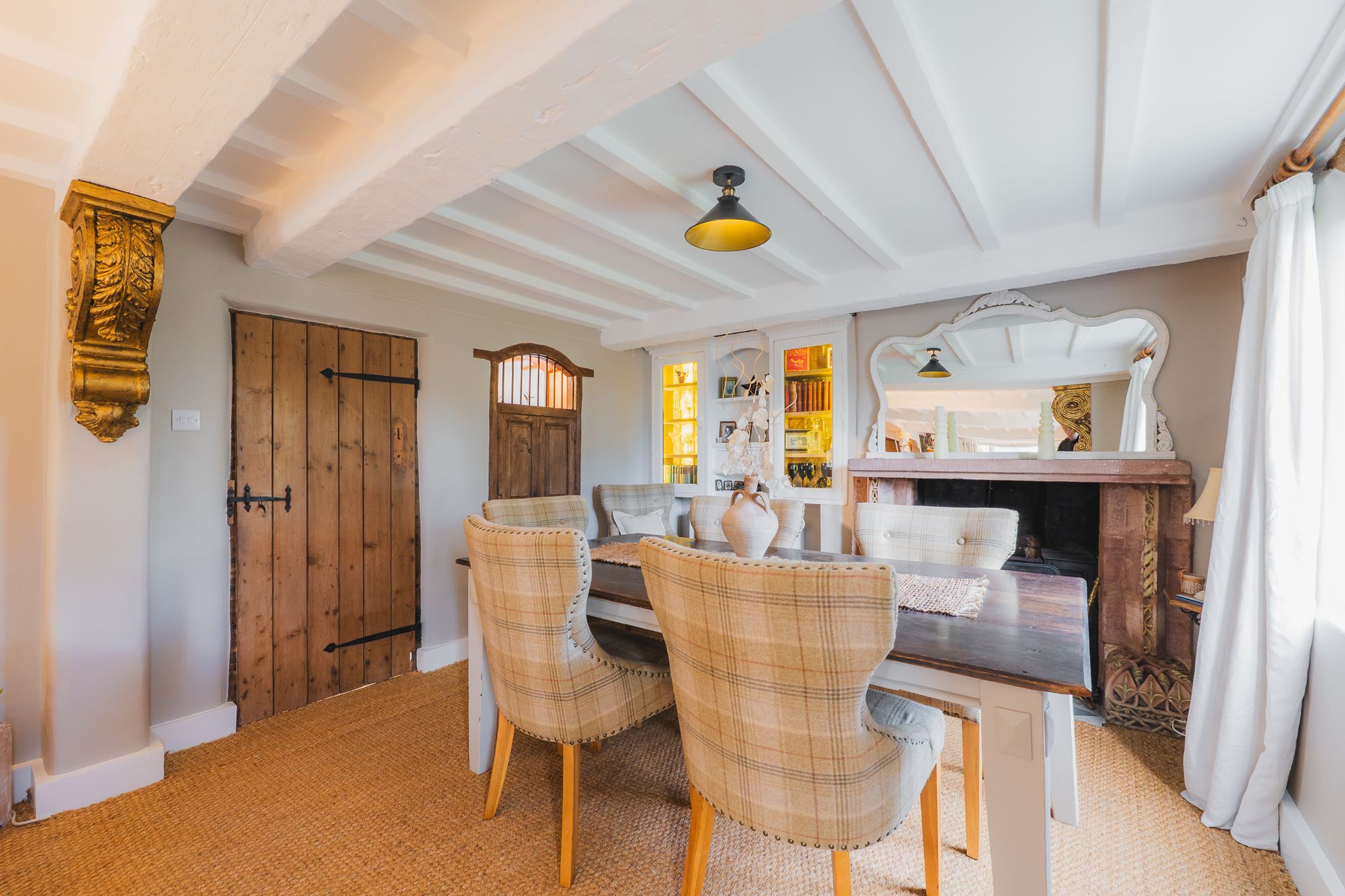 With its white painted ceiling and beams, the lounge, next door, bridges the past and present, retaining its original black Range, now framed in a sandstone surround. Ornate corbels, alcove shelving and a second, incredible inglenook fireplace create utterly unique character, with ample space to both relax and dine at the large table. With windows and a glazed door opening out to the formal parterre garden at the side, alongside French doors connecting invitingly to the rear patio, the lounge is another versatile and spacious room, ready to mould around any lifestyle.