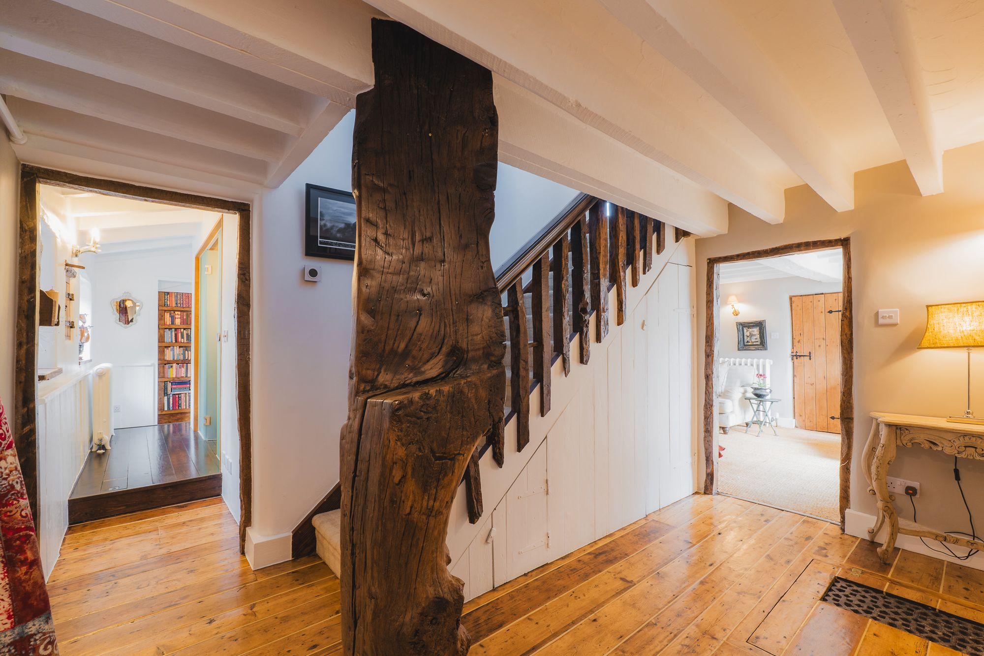 A broad parking area with paving setts provides ample space for several cars, while stone steps lead down to a studded oak front door set within the home’s solid stone façade. Indoors, the plum painted exposed stone of the entrance hall casts a warm glow, matched with wooden flooring that continues through to the left.