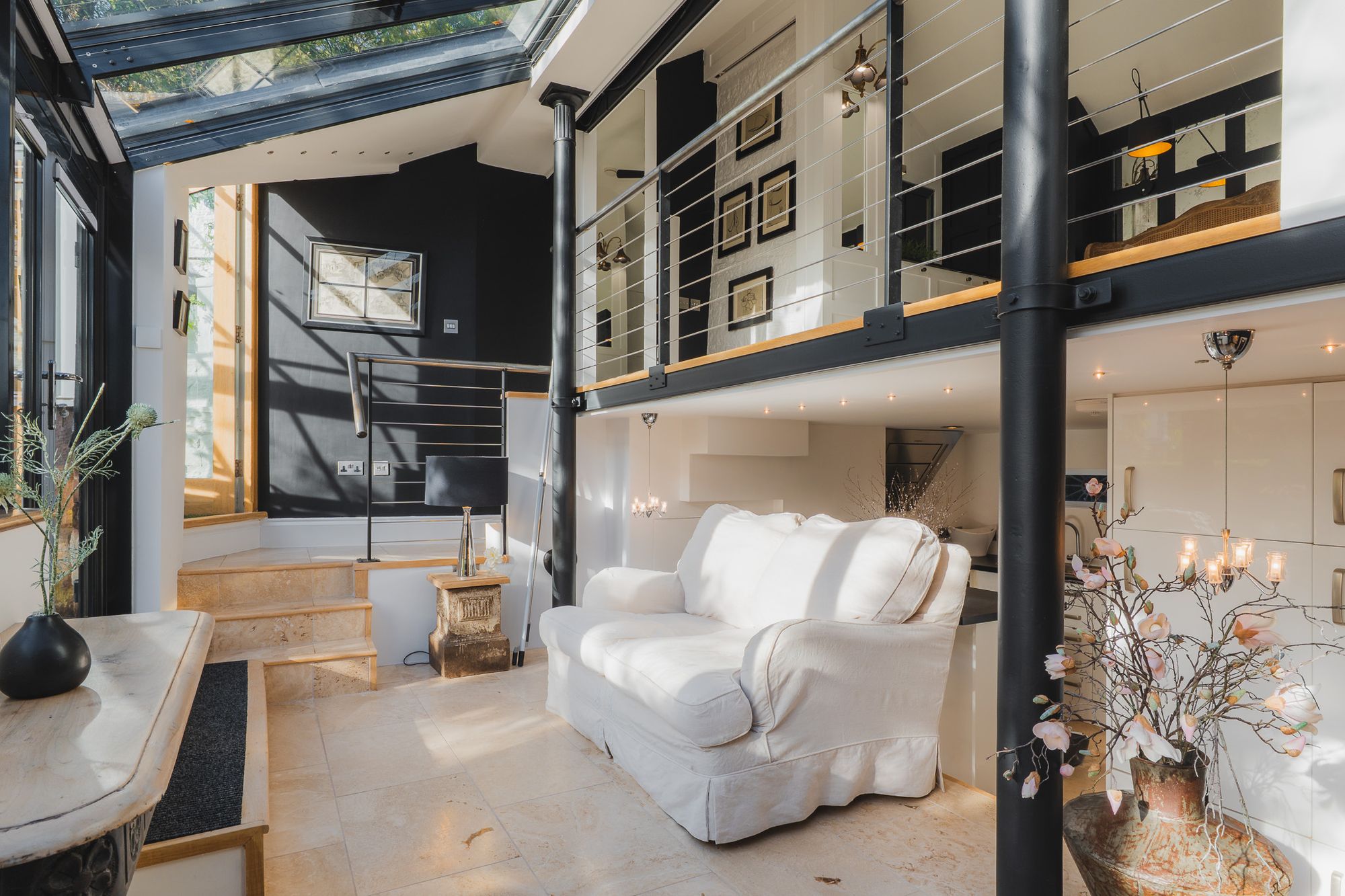 Step up from the main kitchen and the garden room is washed with light, with double height ceiling and windows offering far reaching views out over the courtyard garden. A versatile space designed for entertaining, to the right discover breakfast bar seating, another oven and hob, a dishwasher, fridge, and freezer, making it the perfect setup for hosting, particularly at Christmas when it becomes the social hub of the home. Furnished with underfloor heating for cooler days, fitted blinds add to the ambience.
