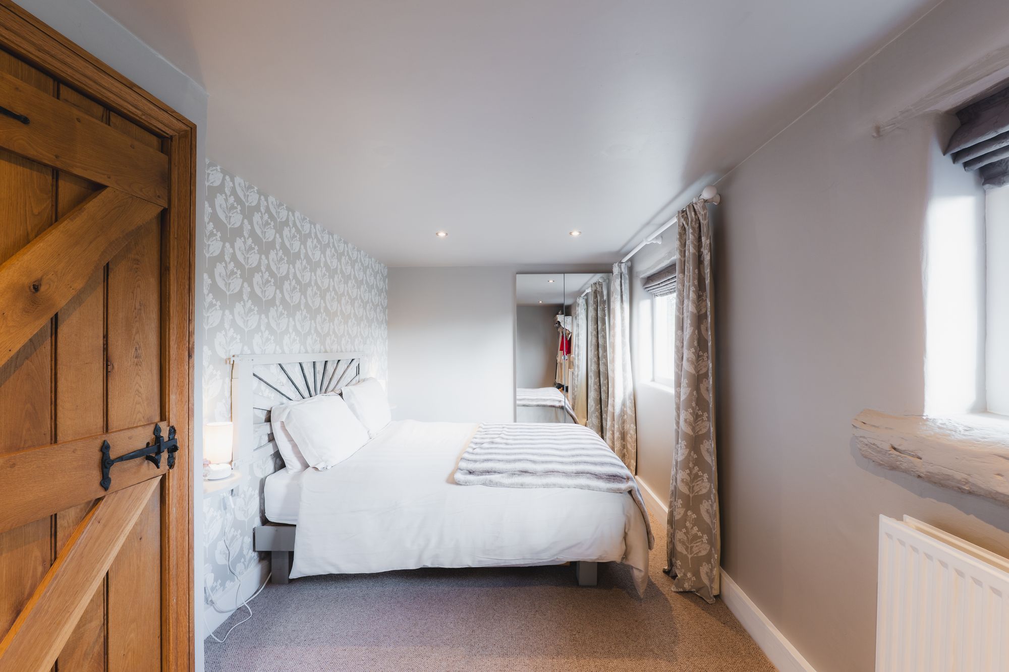 Panelling and beams embellish the walls along the landing, where the first of the bedrooms brims with light beneath a high, vaulted ceiling furnished with Velux windows. With views out over the front of the home and plenty of wardrobe space, this bedroom offers ample space for a double, but is ideal for children or as a nursery, connecting through to the master bedroom beyond.