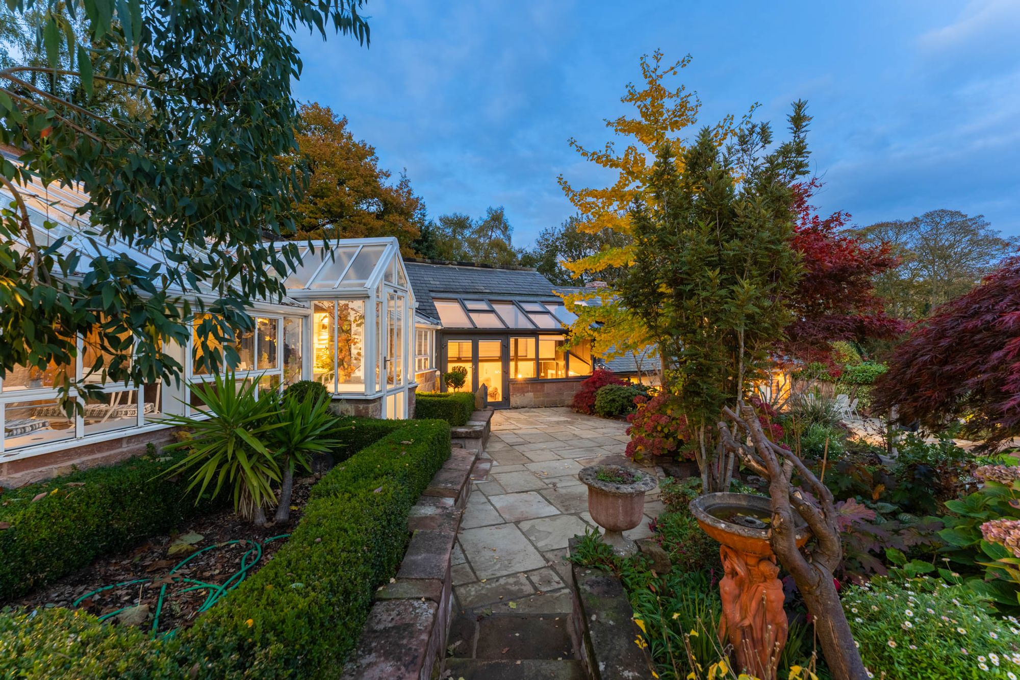 A true ‘potterer’s garden’, the gardens, like the home, have evolved over many years from an untended, sloping plot into a lovingly transformed, mature landscape.