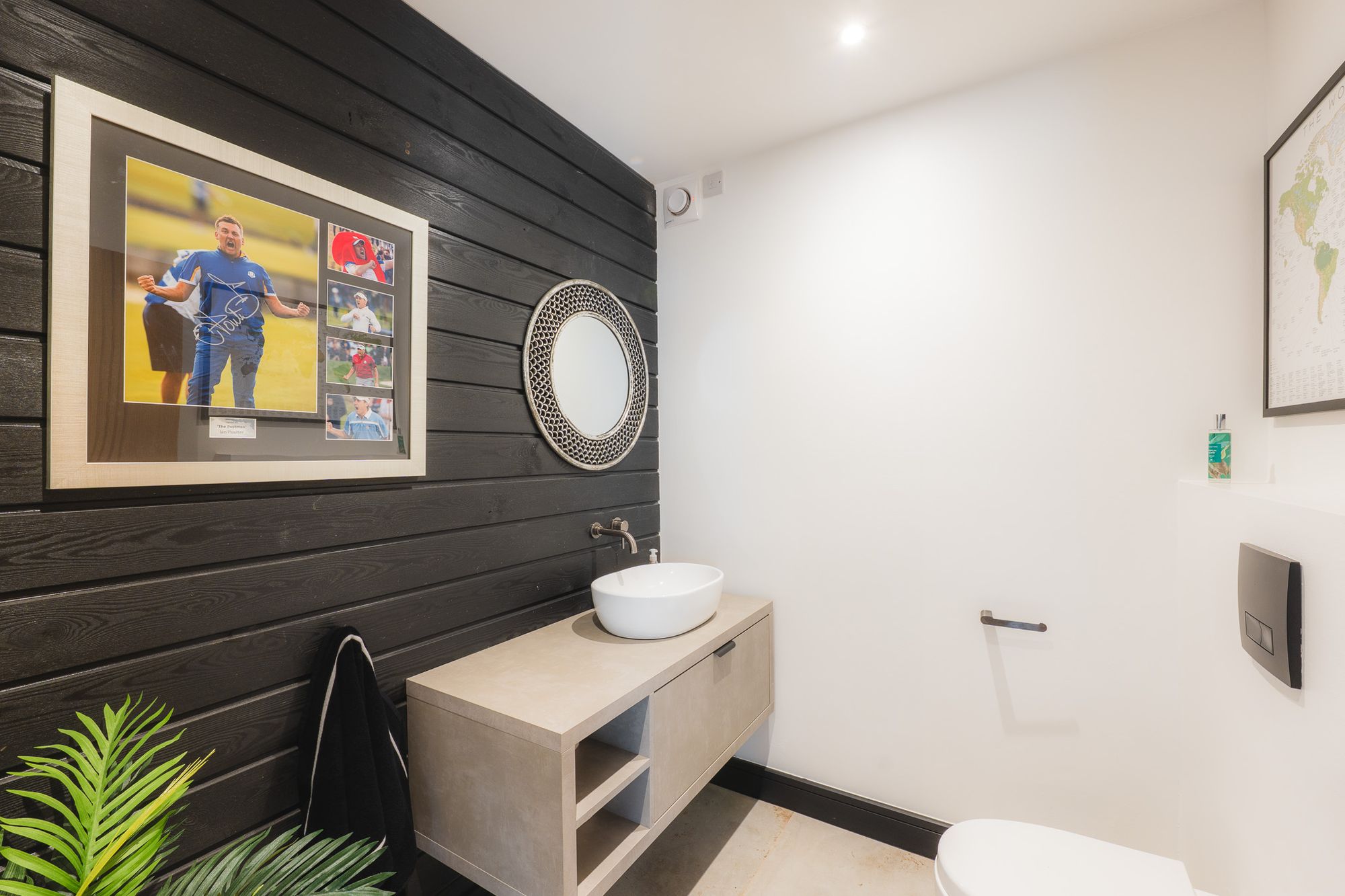 Returning to the hallway, tucked off to the right of the front door upon entry, the lounge offers a moody, more cocooning contrast to the light, bright palette found throughout the rest of the home. Finished in deep charcoal grey, with a media wall providing a natural focal point, this space feels calm, clean and chic, perfect for cosy evenings in the snowy depths of winter.
