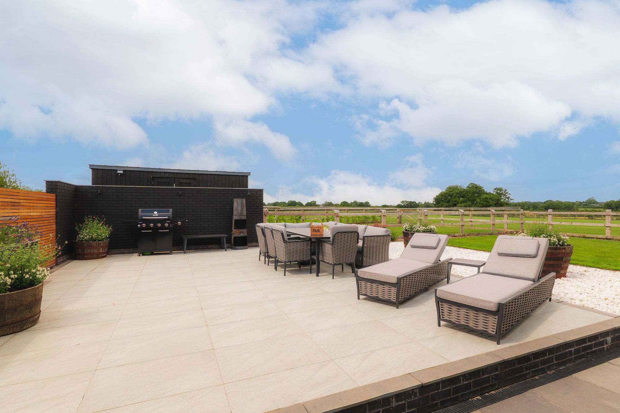 Flowing out from the kitchen, a large, landscaped patio provides the perfect spot for barbecues, long lunches and evenings around the firepit, with spaces for both dining and relaxed seating beneath wide, open skies.