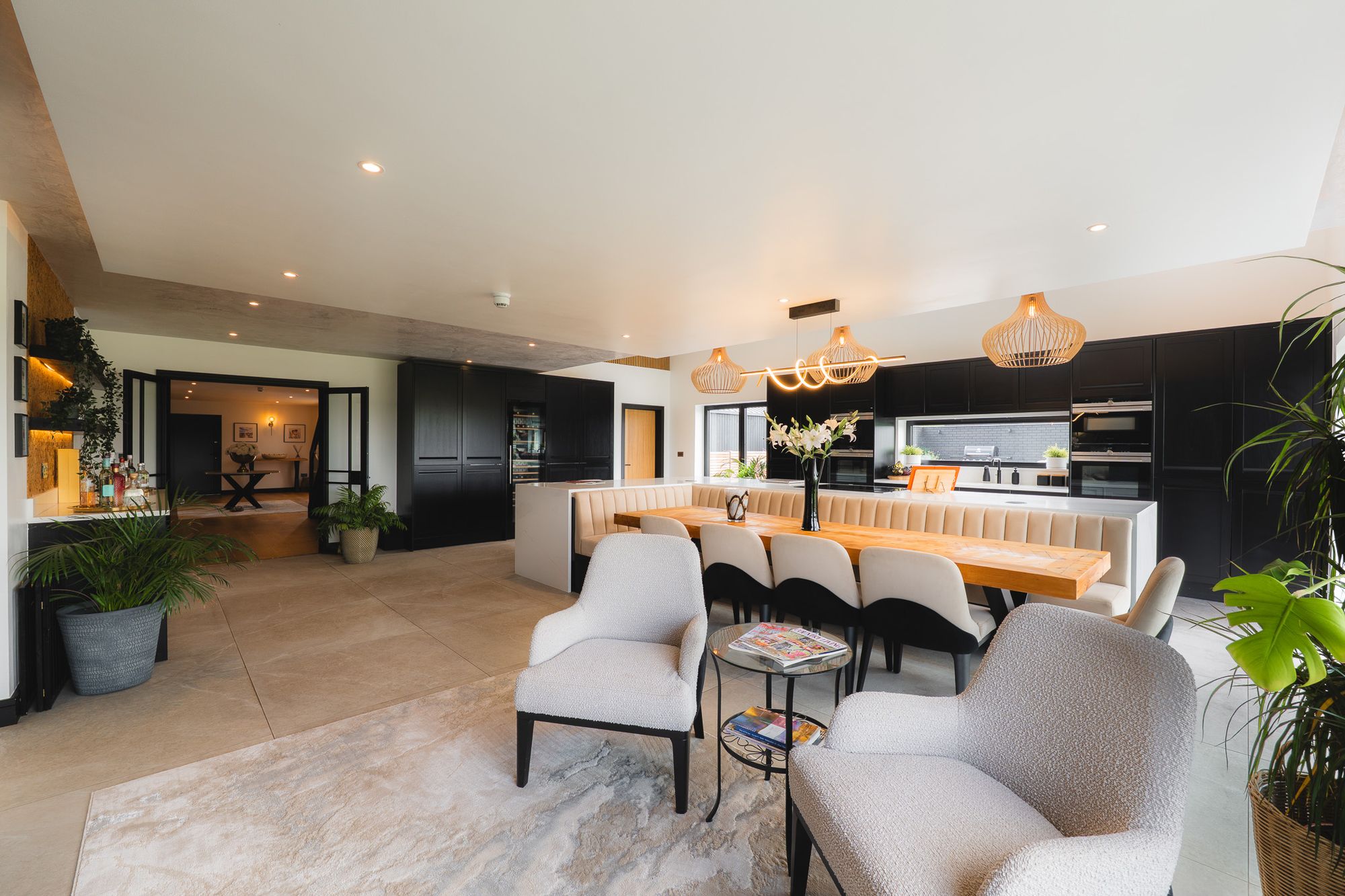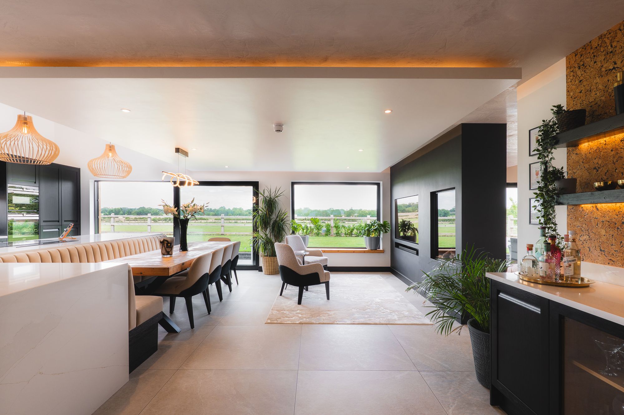 To the far end of the kitchen, large lift-and-slide doors open onto a rear patio, framingstunning, uninterrupted views across open countryside, a space designed to bring the outdoors in and showcase the changing of the seasons. To the side, French doors lead to an additional patio, perfect for al fresco dining, relaxing and entertaining in the fresh air.