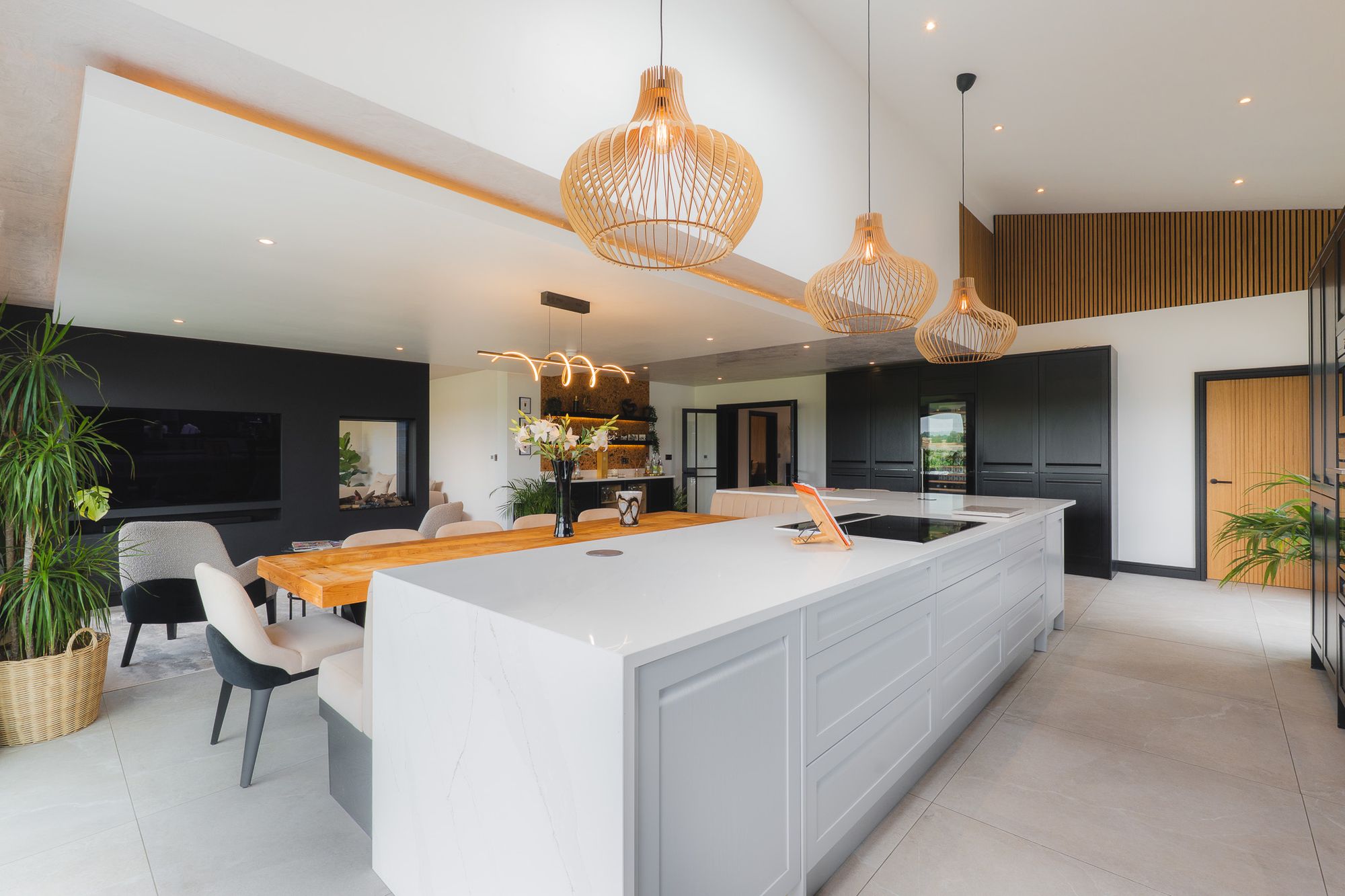 Storage is plentiful, with two walk-in larders, alongside under-counter bins and a Siemens integrated dishwasher housed within the island.