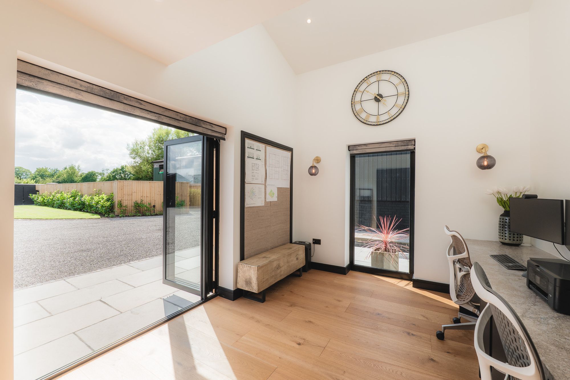 Double Crittall-style doors open off to the left, where bifolding doors connect the office to the front of the home, offering an easy flow to the outdoors. A long run of Quartz worktop forms a practical double desk space, ideal for home working, while a picture window to the side keeps countryside views, and the arrival of visitors, firmly in sight. Bright, calm and tucked away from the main living spaces, the office is a place for private productivity.
