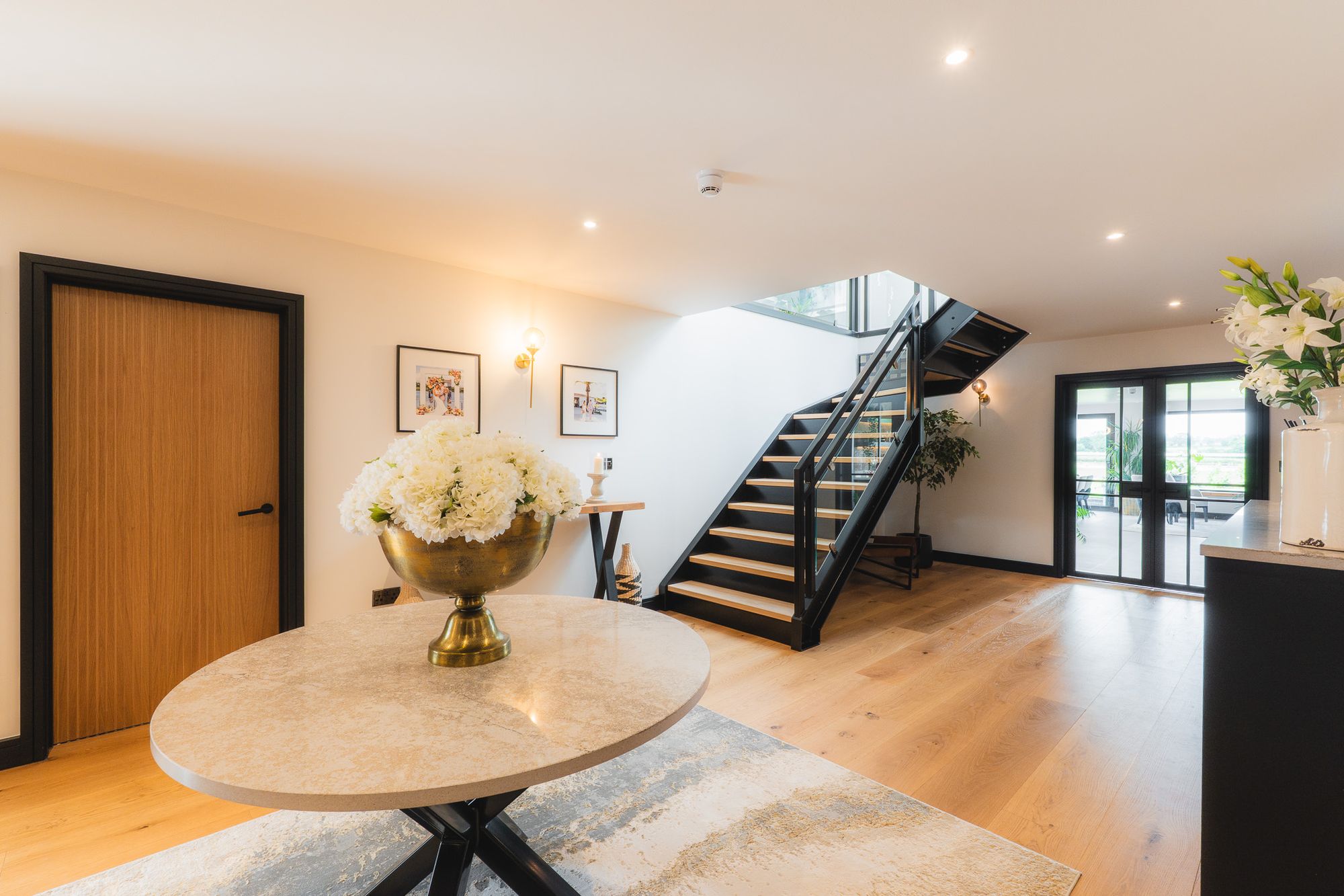 Clean white walls and deep black detailing frame the bespoke, steel architectural staircase, while full height glazing ahead invites natural light to pour through, drawing the eye towards the garden beyond.