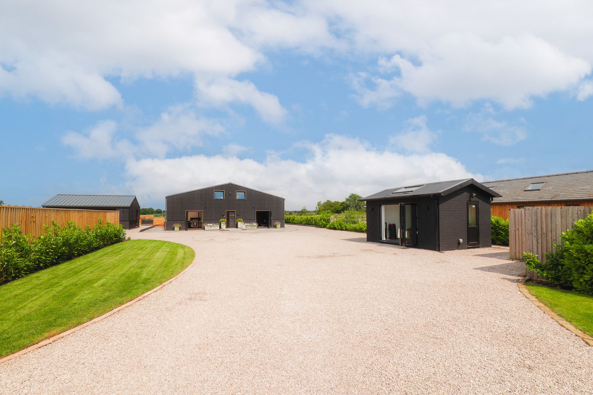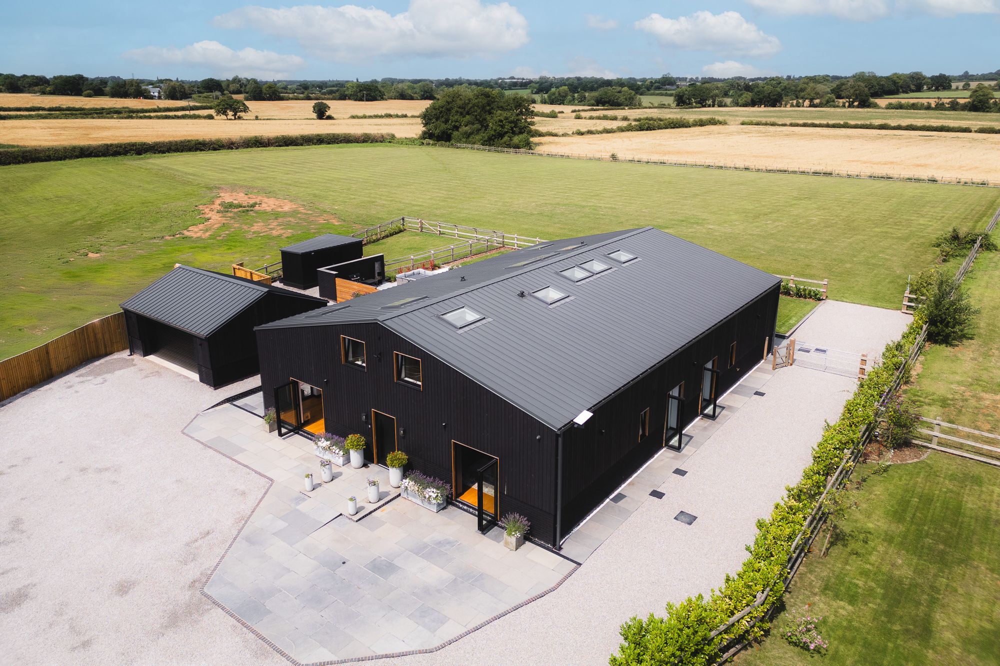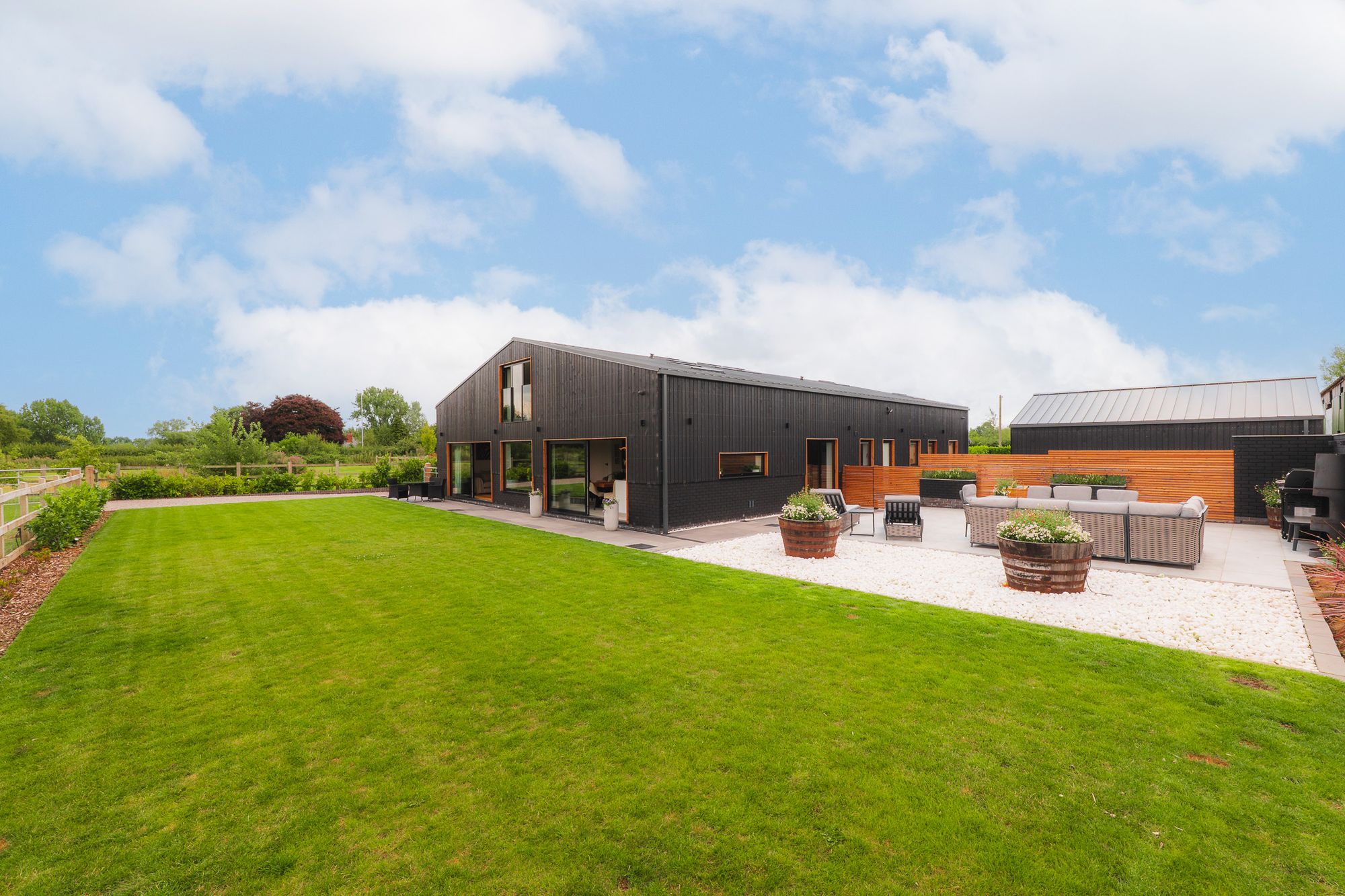 A timber-built shed behind the barbecue area provides storage, while a separate garden building serves as a gym, complete with roof lights, electric underfloor heating and plenty of sockets. Versatile by design, it could work equally well as a home office, with scope to add a WC if desired.