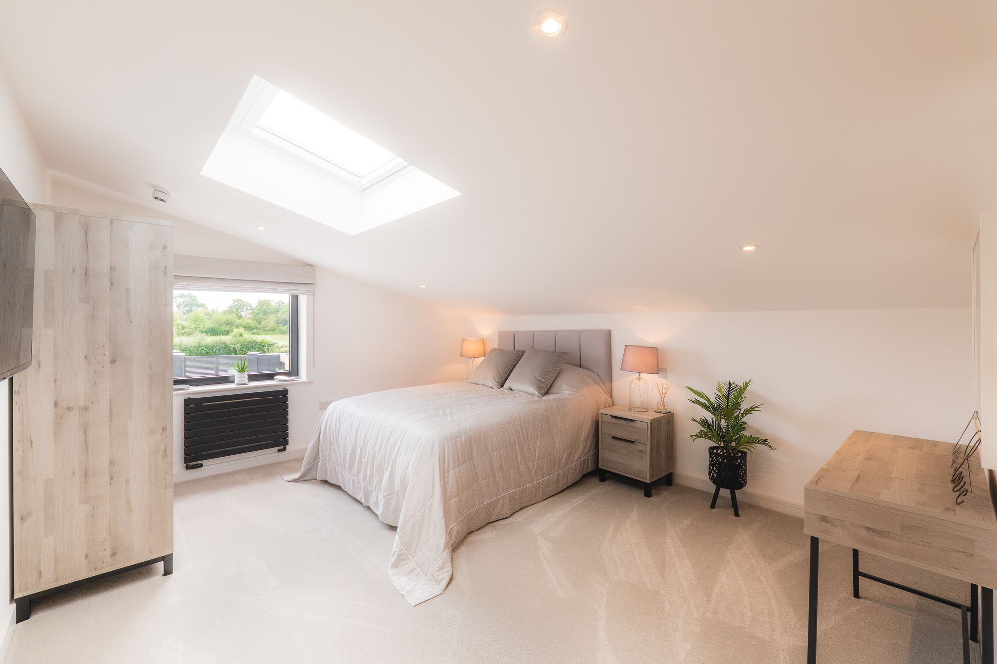 On the left, bedroom three basks in an abundance of natural light, drawn down by oversized Velux windows, considerately fitted with built-in electric blinds for effortless control.