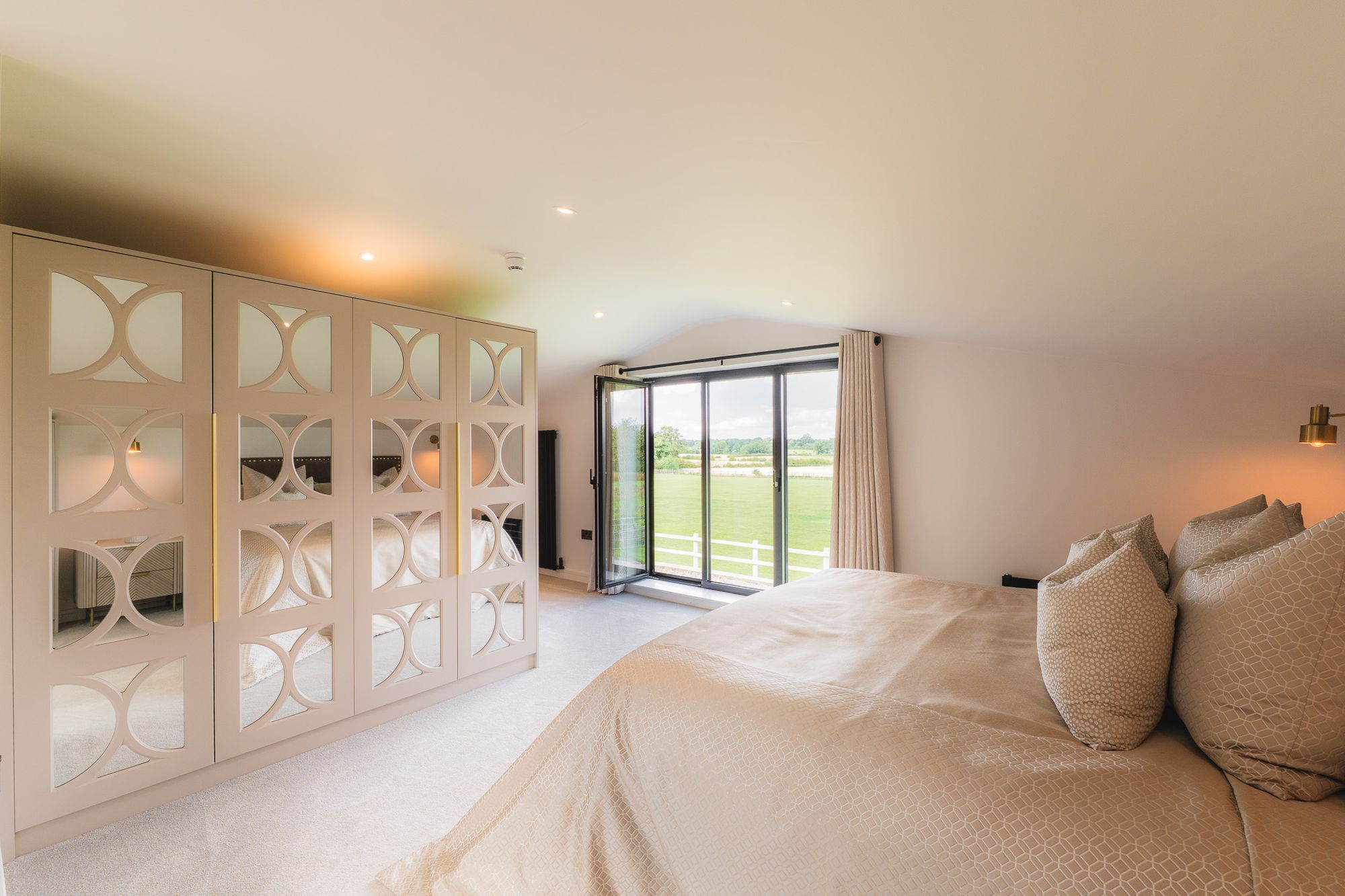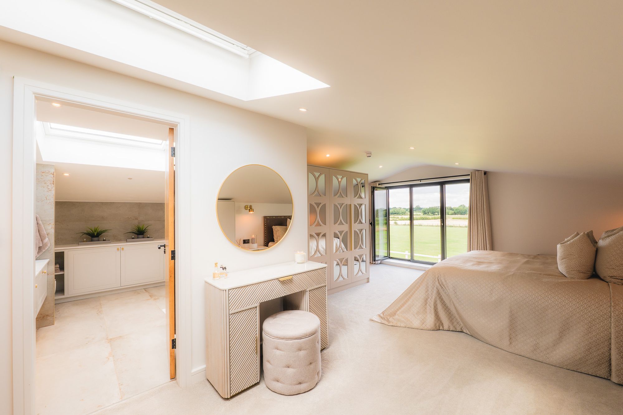 Both rooms brim with boutique comfort, from soft carpets to vaulted ceilings with exposed beams adding a sense of airiness, while the black-framed Crittall-style doors continue the home’s strong, cohesive design. The second bedroom also offers abundant storage with walk-in wardrobes.