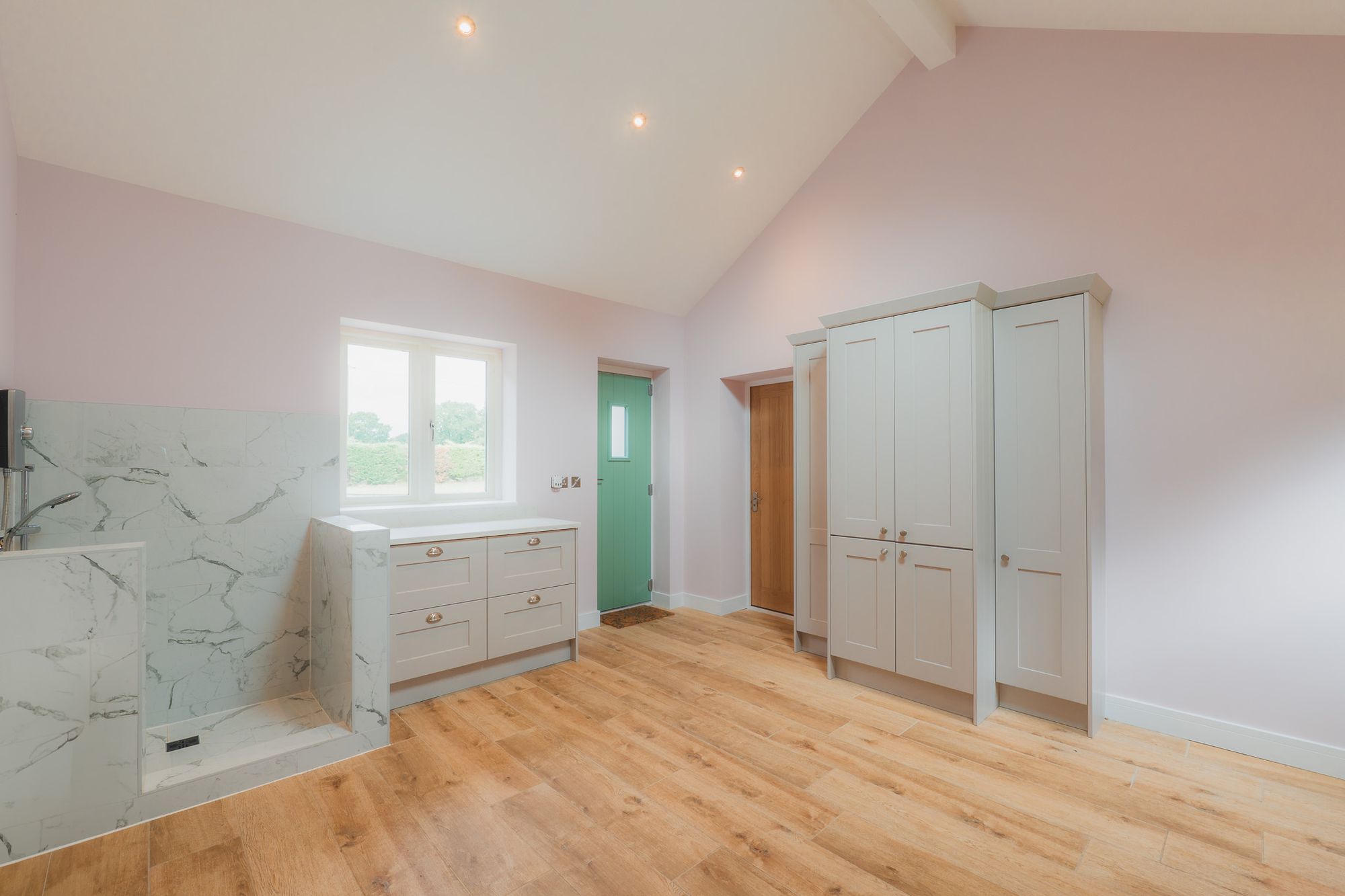 Fitted with sleek cabinetry, integrated laundry appliances and its own exterior door, the utility has been cleverly designed with real life in mind, from muddy boots to mucky pups. There’s even a built-in dog shower, which can also be used for rinsing down garden-coated children too.